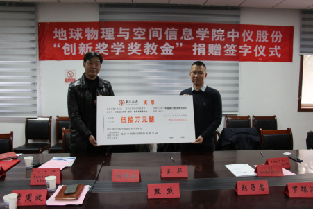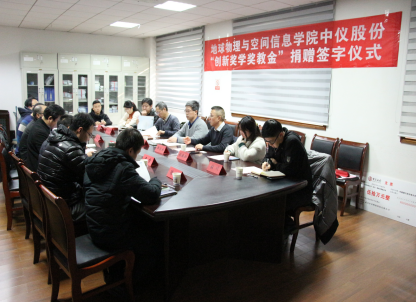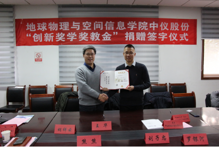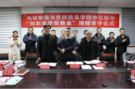 (通讯员 张川 )1月14日下午,德赢官网中仪股份“创新奖学奖教金”捐赠仪式在物探楼214会议室举行。武汉中仪物联技术股份有限公司董事长郑洪标、总经理助理张婉珈,副校长王华,学校教育发展基金会副秘书长吕占峰,德赢官网党委书记刘子忠、院长熊熊、副书记李周波、副院长罗银河、胡祥云教授及学院教师代表、学校教育发展基金会工作人员等出席。仪式由学院党委副书记李周波主持。