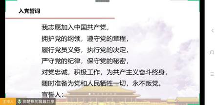 九点四十五,活动正式开始,首先德赢Vwin官方区域合作伙伴地探专业硕士研究生纵向党支部支部书记郭楚枫带领大家唱国歌,重温入党誓词。