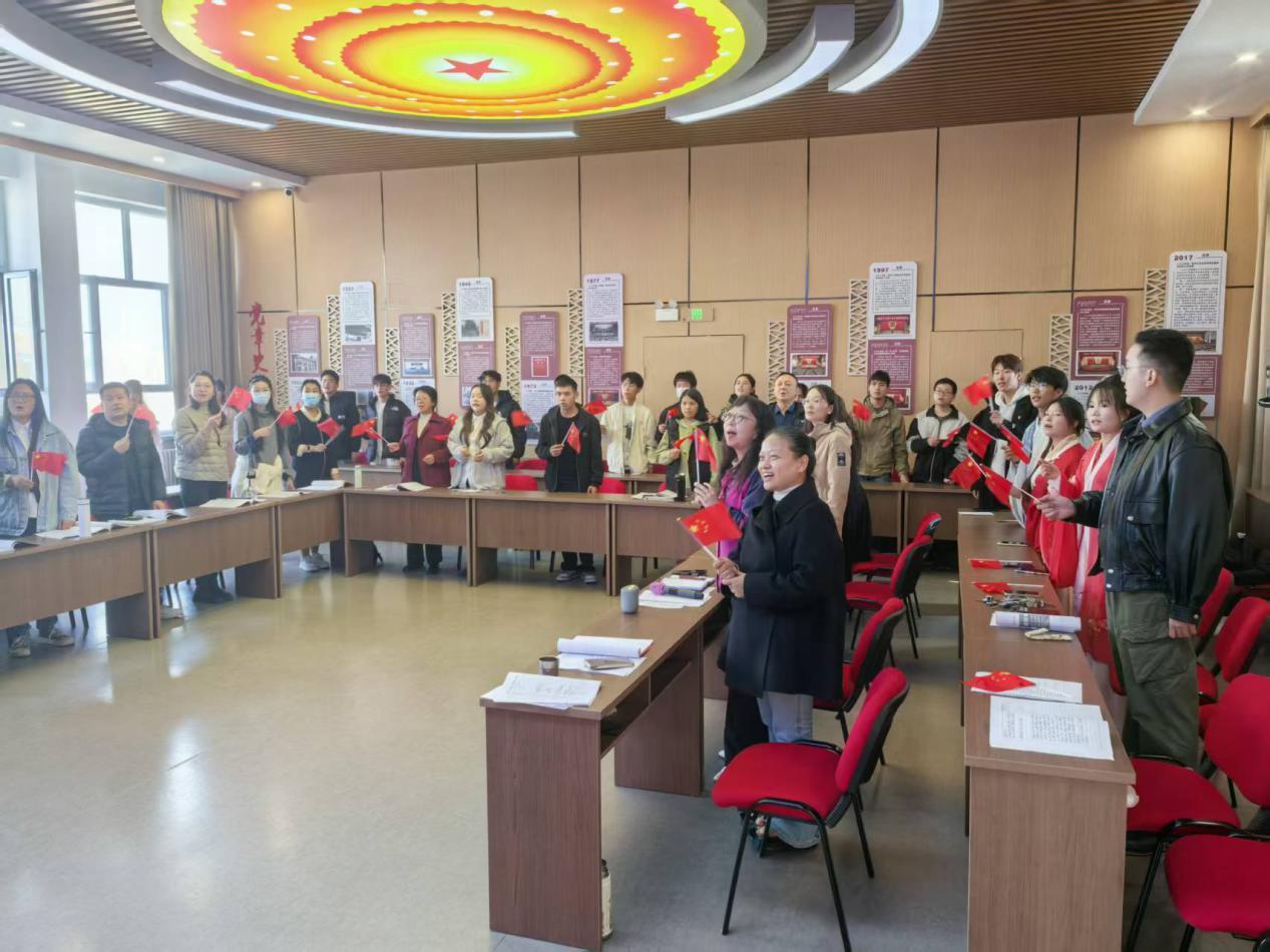 活动尾声,全体师生起立,共同唱响《我和我的祖国》。激昂深情的歌声在会议室回荡,将现场气氛推向高潮,表达了全体师生对祖国母亲的无限深情与坚定跟党走的共同信念。