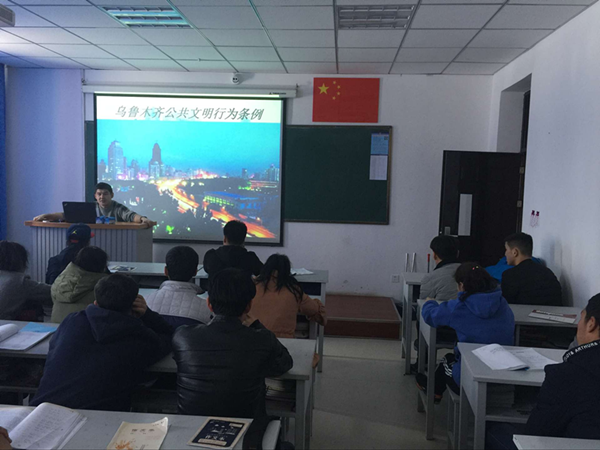 为进一步贯彻落实引导学院师生了解、遵守《乌鲁木齐市公共文明行为条例》、将“做文明人·创文明城”的思想入脑入心,自觉践行文明行为,扎实开展思想道德建设工作,推进创建全国文明城市进程,3月22日下午德育课时间,基础教学部积极组织“三进两联一交友”所有结对子老师进班与班主任一起学习宣传《乌鲁木齐市公共文明行为条例》内容,向广大师生发出倡议,做一个懂法、守法、说文明话、做文明事的文明市民!