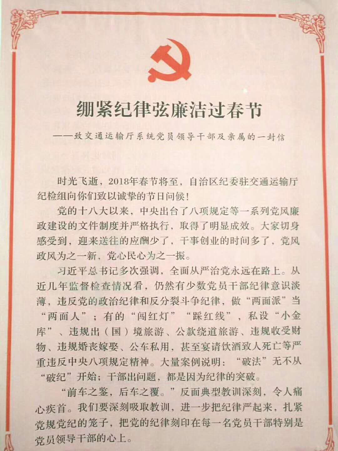 紧绷纪律弦 廉洁过春节--致交通运输厅系统党员领导干部及亲属的一封信