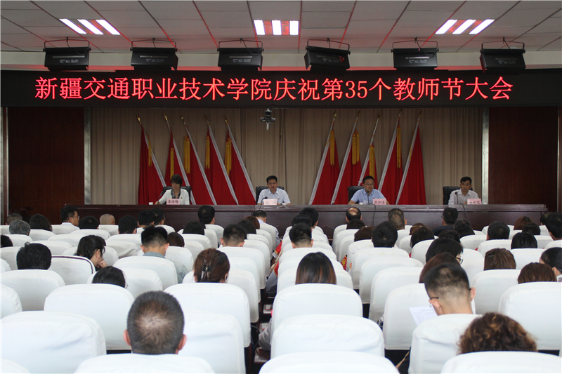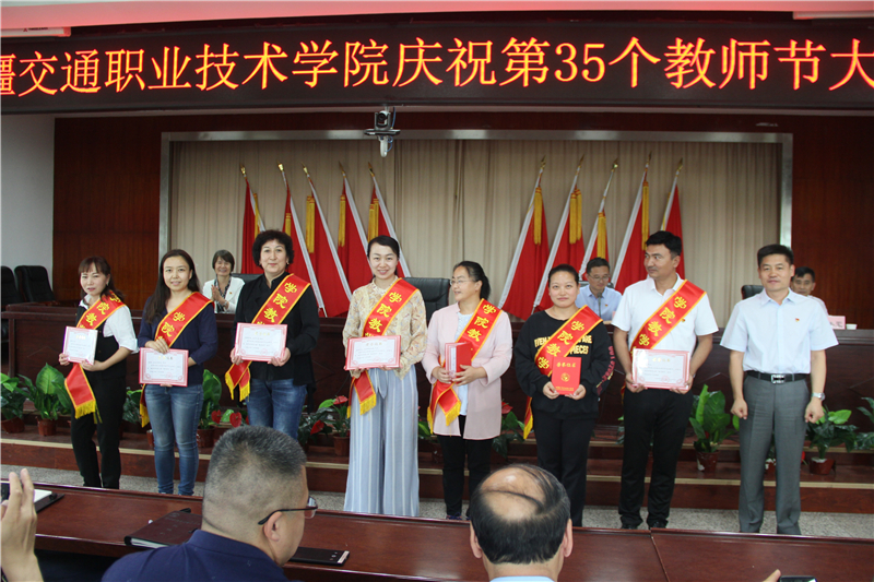 为热烈庆祝新中国成立70周年和第35个教师节,深入落实全国教育大会、自治区教育大会精神,大力弘扬尊师重教的良好风尚,增强广大教师的荣誉感、责任感,集中展示学院广大教师学习贯彻习近平新时代中国特色社会主义思想、全面贯彻落实全国教育大会和自治区教育大会精神的实际成效,展现新时代学院广大教师爱国奉献、立德树人、践行总目标,谱写新疆篇章的新形象新风貌,2019年9月9日下午学院在图书馆多功能厅召开了庆祝第35个教师节暨表彰大会,隆重表彰了学院优秀教师、优秀辅导员、优秀班主任、教学名师和教学能手。