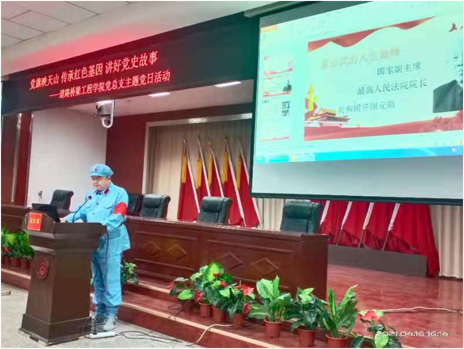 为深入贯彻落实习近平总书记在党史学习教育动员大会上的重要讲话精神,引导全院党员、教职工重温党的历史,感悟红色精神,4月16 日,道路桥梁工程学院开展了“党旗映开山 传承红色基因”讲好党史故事主题党日活动。活动在全体党员齐唱《国际歌》中拉开帷幕。