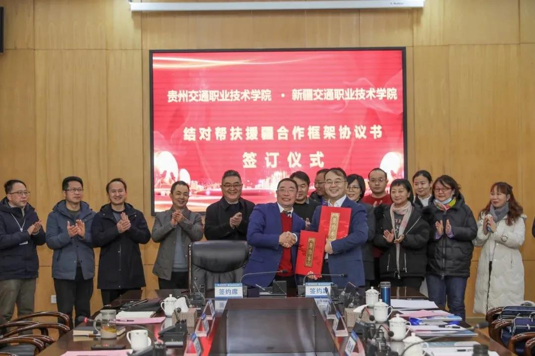 为进一步贯彻落实2021年全国职业教育大会精神,加快推进贵州特色教育强省建设,促进新疆地区职业教育发展,提升贵州职业教育服务贡献能力。1月8日,贵州交通职业技术学院与新疆交通职业技术学院正式签订结对帮扶援疆合作框架协议,从人才培养提质培优、专业群建设、课程建设及技能竞赛等方面深度合作协同发展。