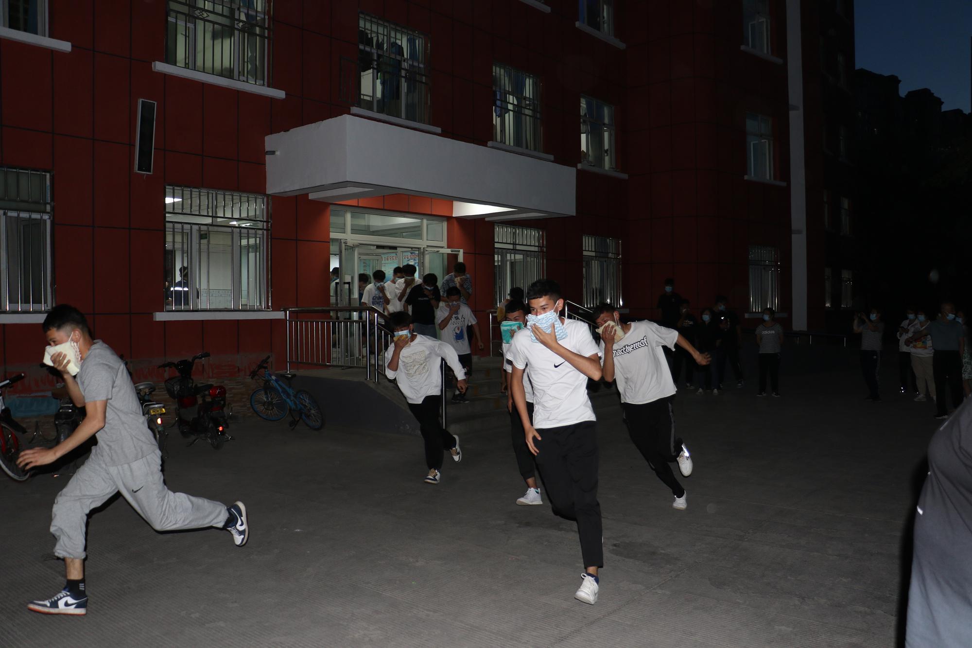22点整,演练总指挥汽车工程学院书记阿布拉江·麦麦提宣布演练开始,随着一阵阵的火灾警报响起,全体同学在老师的指导下,按照规定的路线,快速、有序地往楼下撤离,同学们用湿毛巾捂着口鼻,猫腰靠墙或扶着扶手迅速撤离,秩序井然,各楼层楼梯口、转弯处值班的老师恪尽职守,指挥和疏导学生紧急撤离。