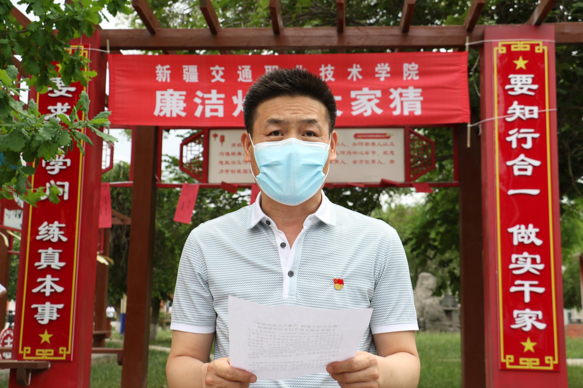 为进一步加强学院廉政文化建设,丰富广大师生的精神文化生活,积极营造全社会风清气正的良好氛围,5月27日,学院在寄语长廊举办了“廉洁灯谜大家猜 清风正气进校园”主题教育暨主题党日活动。学院党委书记、副院长王瀚,学院党委副书记、纪委书记阿巴白克里·阿布拉、学院党委委员、副院长徐长江出席活动。