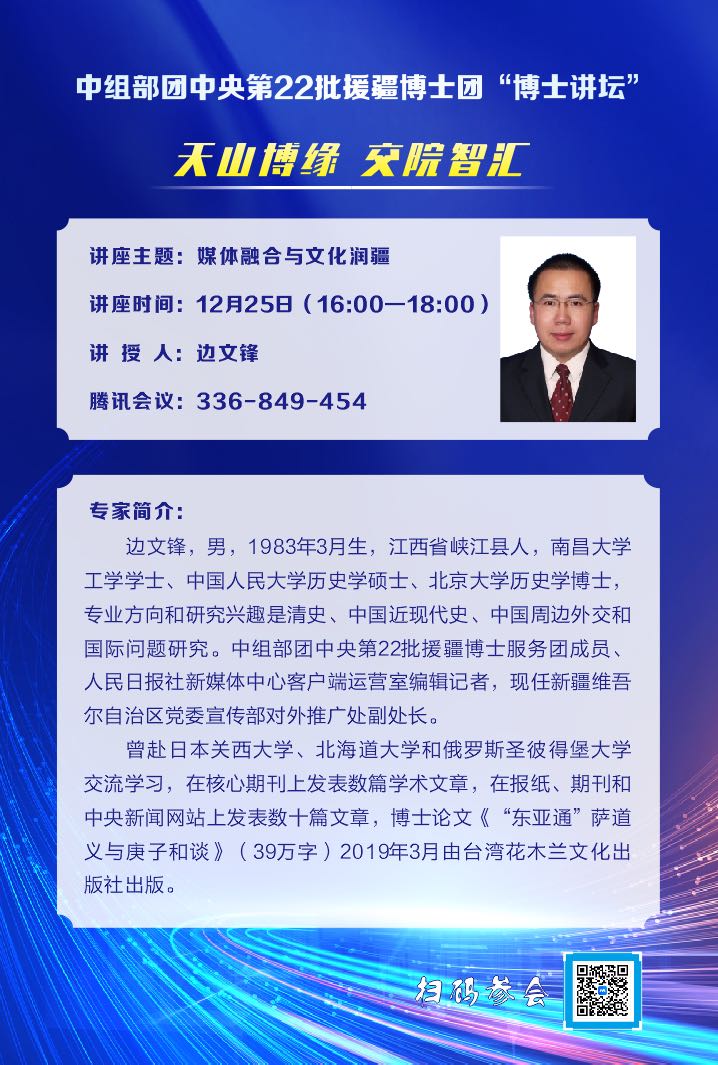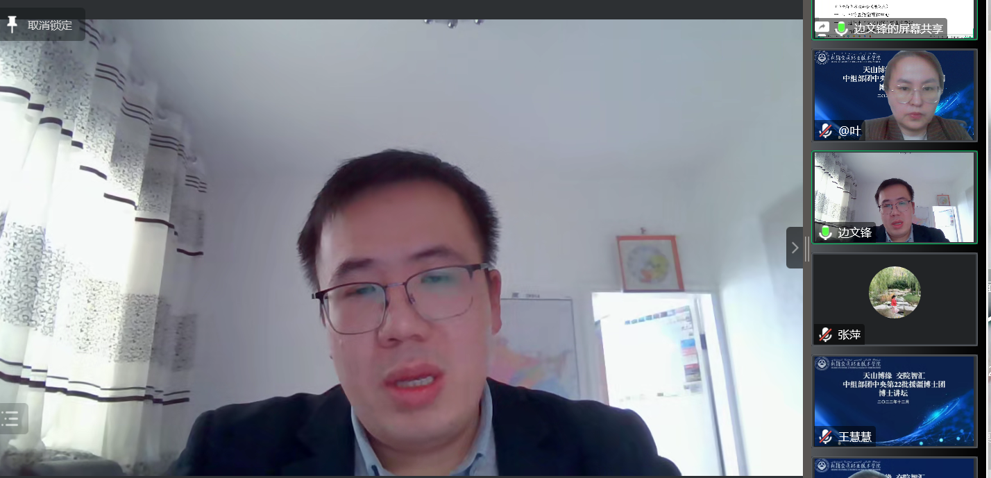 为进一步贯彻落实习近平总书记关于宣传思想工作的重要论述精神,做好新时代高校新媒体工作,提高学院宣传和思政工作质量,12月25日下午,“天山博缘 交院智汇”中组部团中央第22批援疆博士团成员边文锋在云端“走”进新疆交通职业技术学院,为师生做了一场精彩讲座。