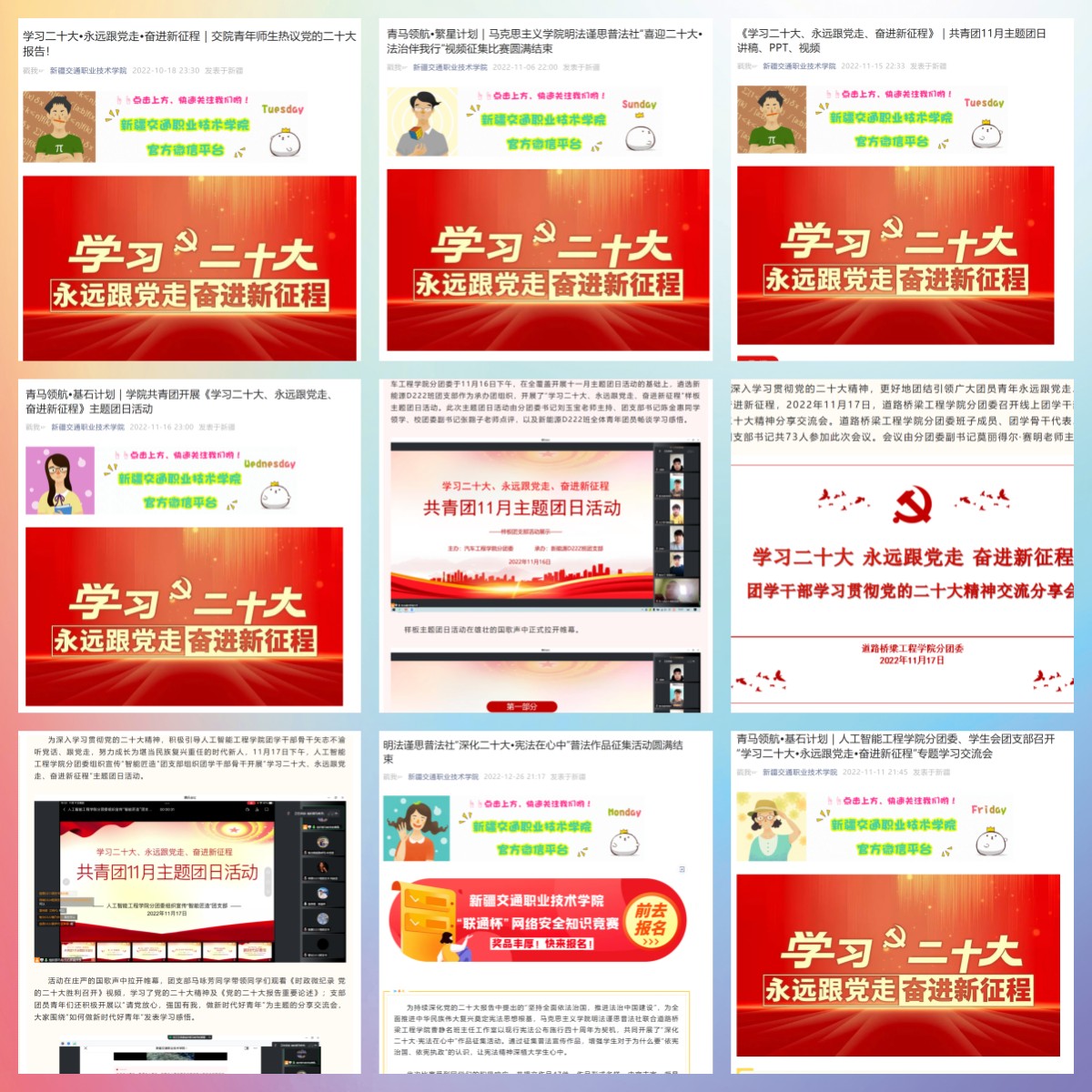 2022年是党的二十大胜利召开之年,也是建团百年。我院共青团工作在学院党委的正确领导下,紧密围绕“立德树人”的根本任务和学校党政中心工作,各级团组织全面履行引领凝聚青年、组织动员青年、联系服务青年的基本职责,探索产教融合背景下高职院校大学生思想引领工作新模式,推动共青团各项工作和建设取得进展,为学院高质量发展和青年成长成才作出积极贡献。