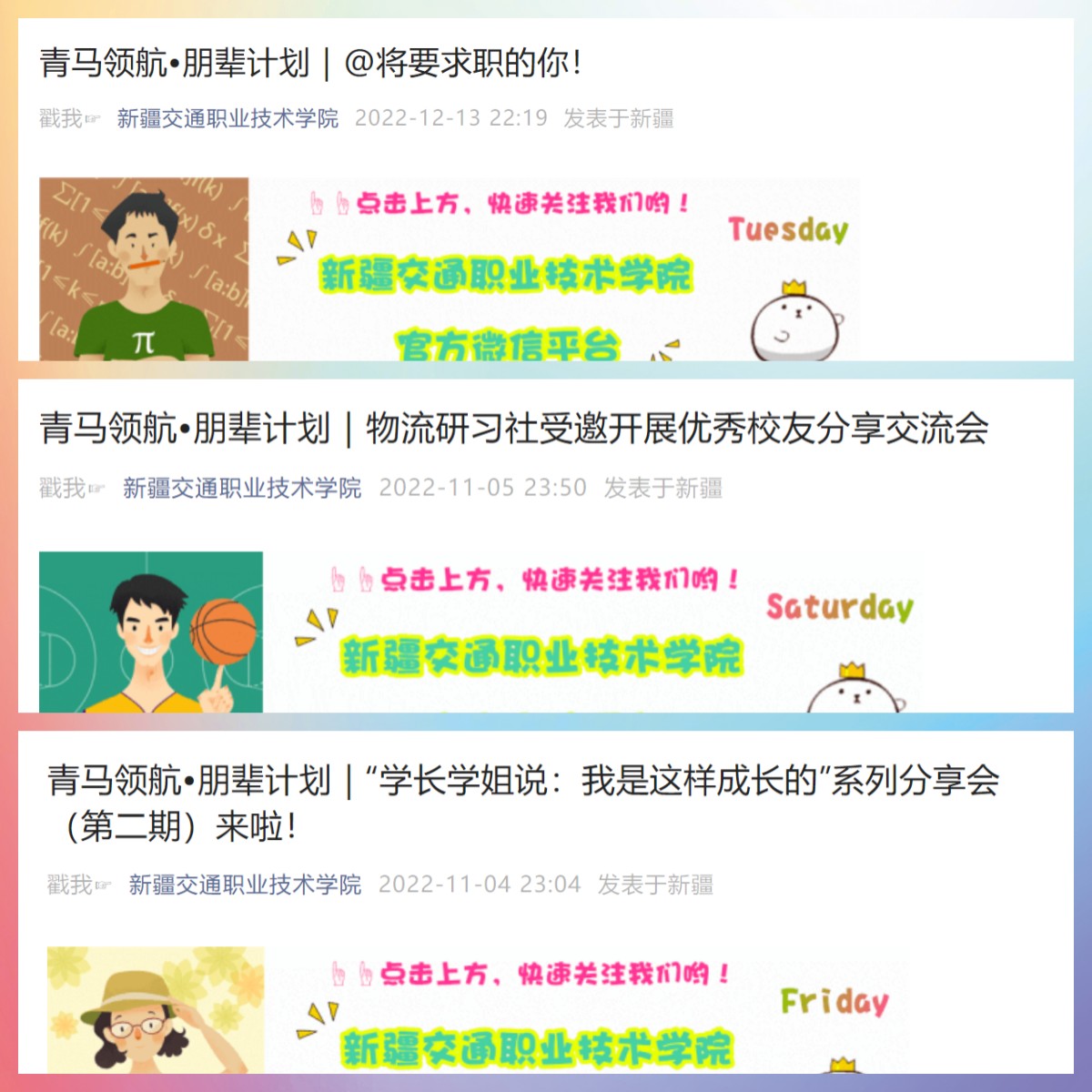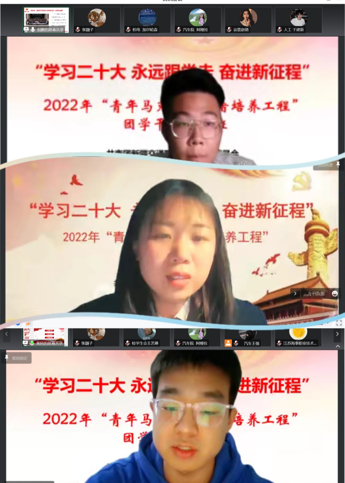 举办“青马论道•朋辈论坛”“学习二十大 青马学员说”专题分享会,邀请到了昌吉学院、江苏海事职业技术学院团学骨干云端相聚,共话成长