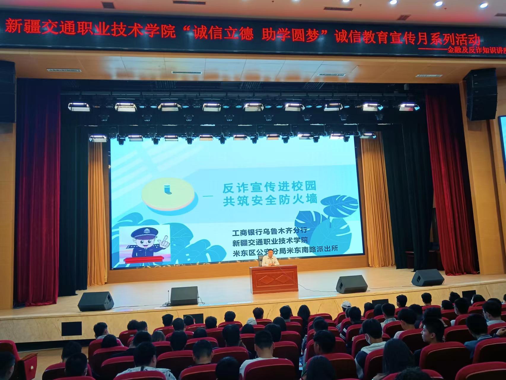 5月22日,学院特邀请工商银行乌鲁木齐卡子湾支行行长刘慧勇、米东公安分局米东南路派出所189警务站副站长杜俊峰在学院大礼堂开展了金融及反诈知识讲座。