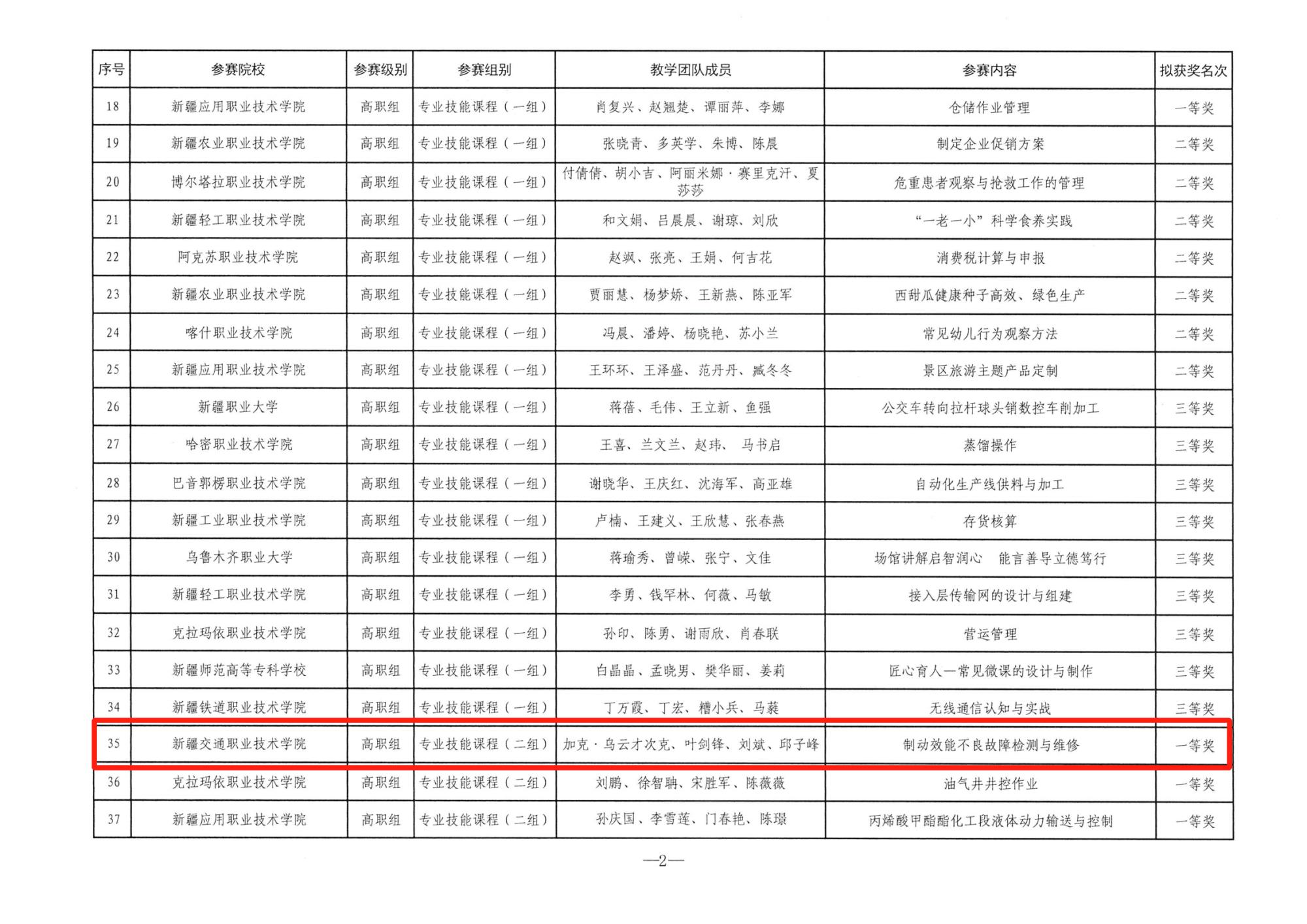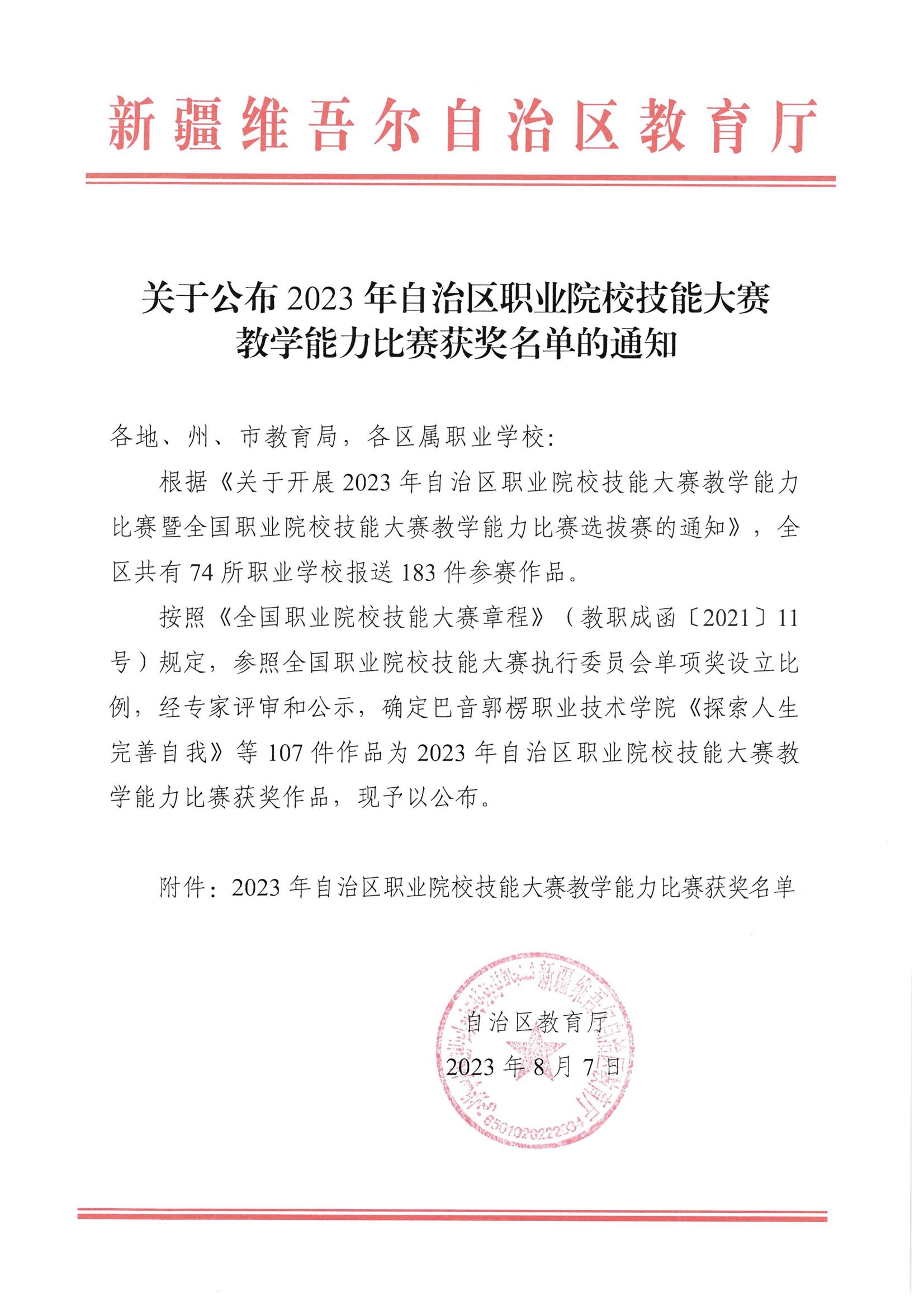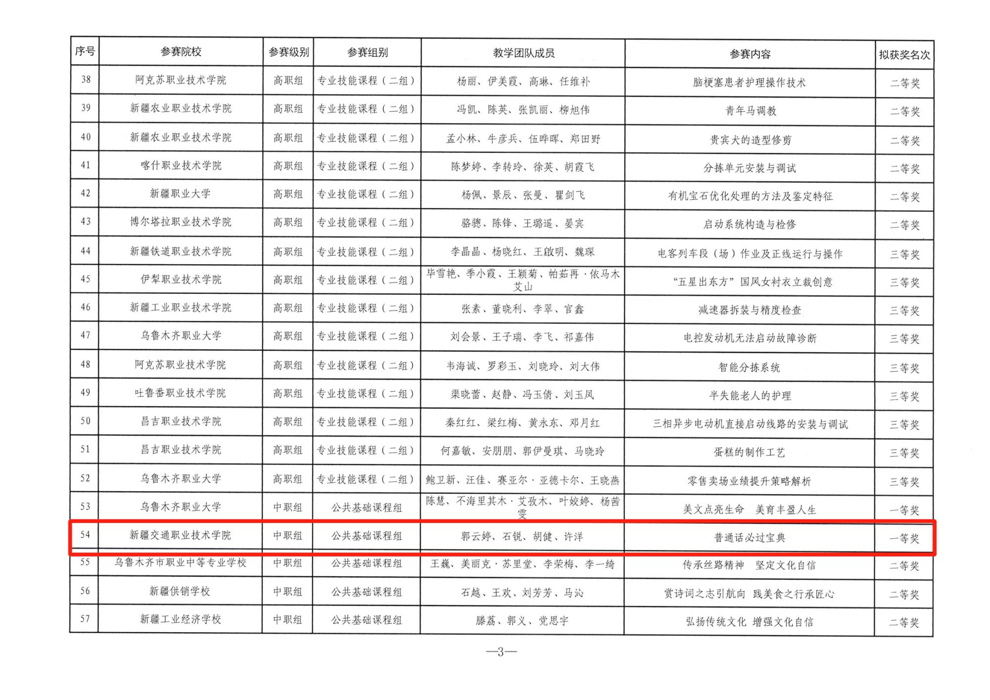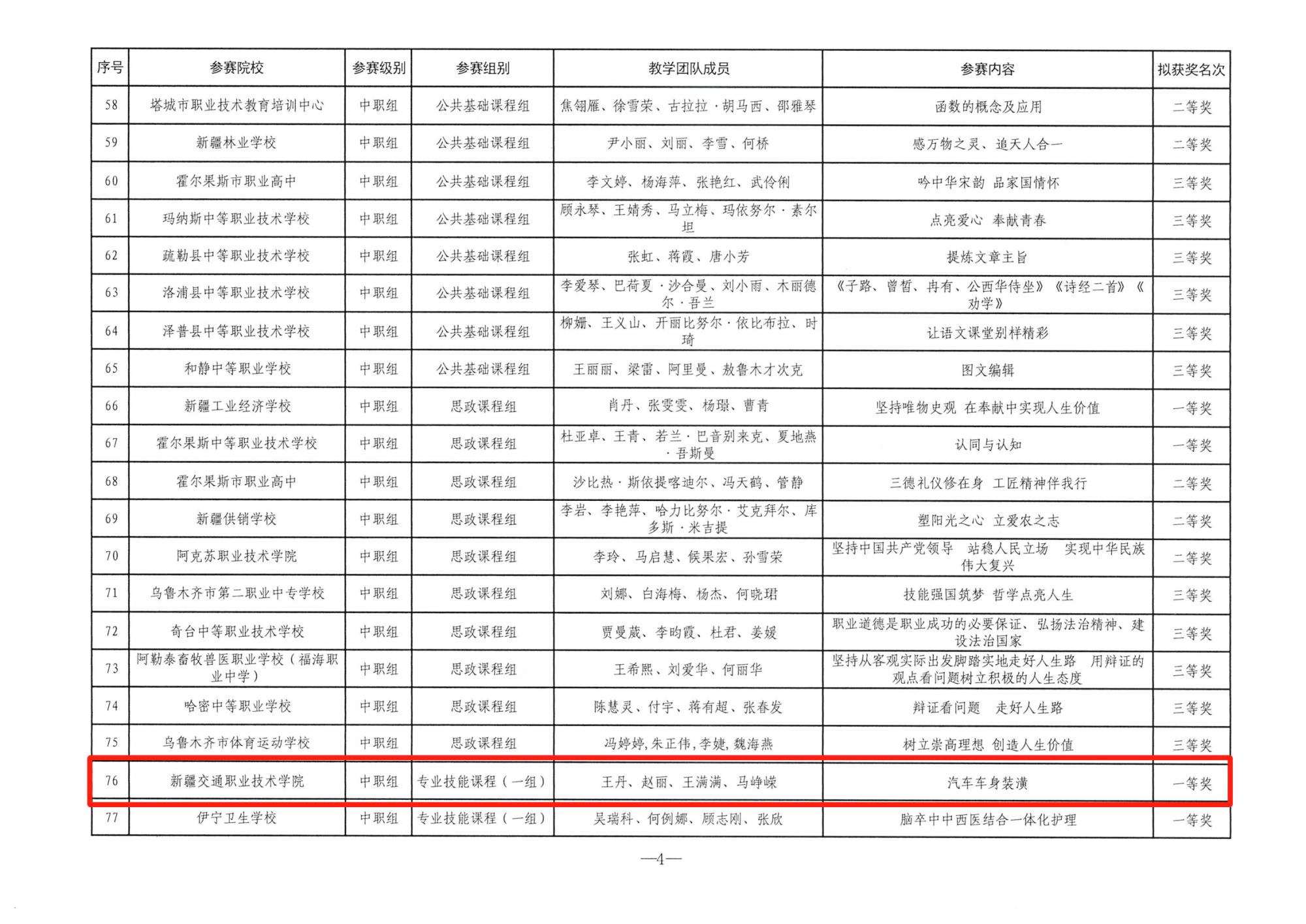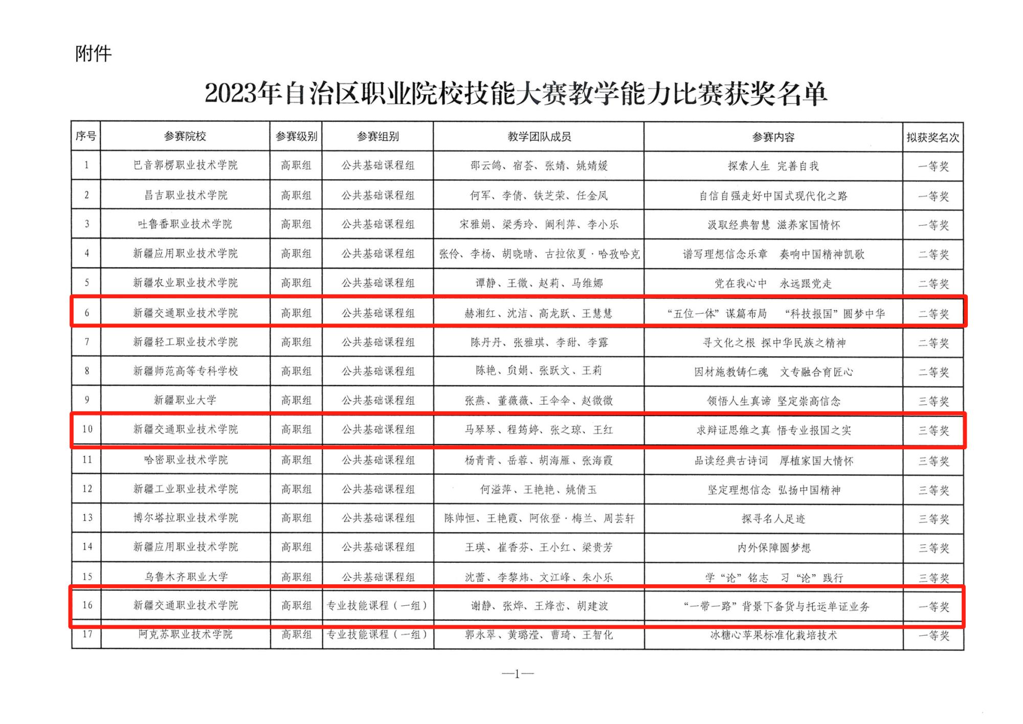 近日,2023年自治区职业院校技能大赛教学能力比赛获奖名单揭晓,学院六支参赛团队荣获四个一等奖、一个二等奖,一个三等奖的好成绩。六支参赛团队以扎实的教学功底、进取的精神风貌和求实求新的教学态度展现了新时代教师队伍风采。