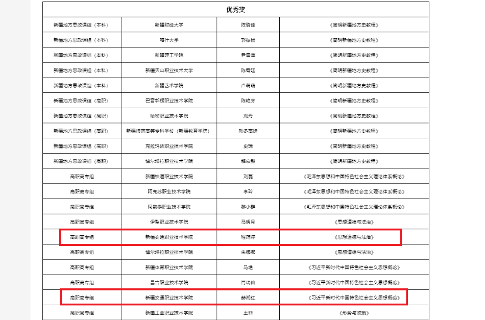 本次比赛共有来自47所高校、213名教师参加,分为研究生组、本科组、高职高专组和新疆地方思政课组。学院参赛教师用自己积极向上、刻苦钻研的钉钉子精神融入课程中,展示出对课程的精准把握、内容的精心选取、学情的精确剖析、教学方法的精妙创新,通过层层角逐徐瑾老师获得《简明新疆地方史教程》课程特等奖、赫湘红老师获得《习近平新时代中国特色社会主义思想概论》课程优秀奖、程筠婷老师获得《思想道德与法治》课程优秀奖。