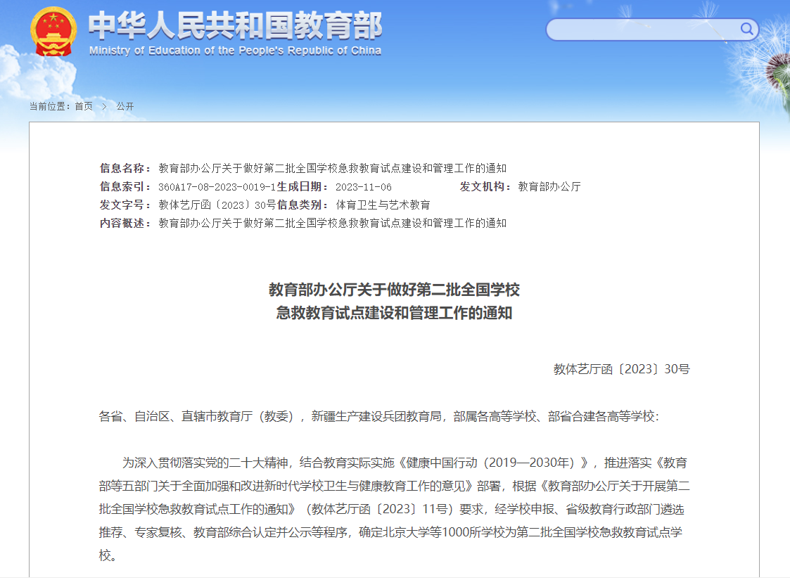 据悉,试点学校是经学校申报、省级教育行政部门遴选推荐、专家复核、教育部综合认定等程序确认产生的。按《教育部办公厅关于做好第二批全国学校急救教育试点建设和管理工作的通知》要求,第二批认定1000所,试点周期为两年,建设目标是以普及急救观念知识和技能为重点,以提升校园应急救护能力为目标,推动在校园内配备急救设施设备,加强青少年和教职员工急救教育培训,完善学校急救教育育人体系。