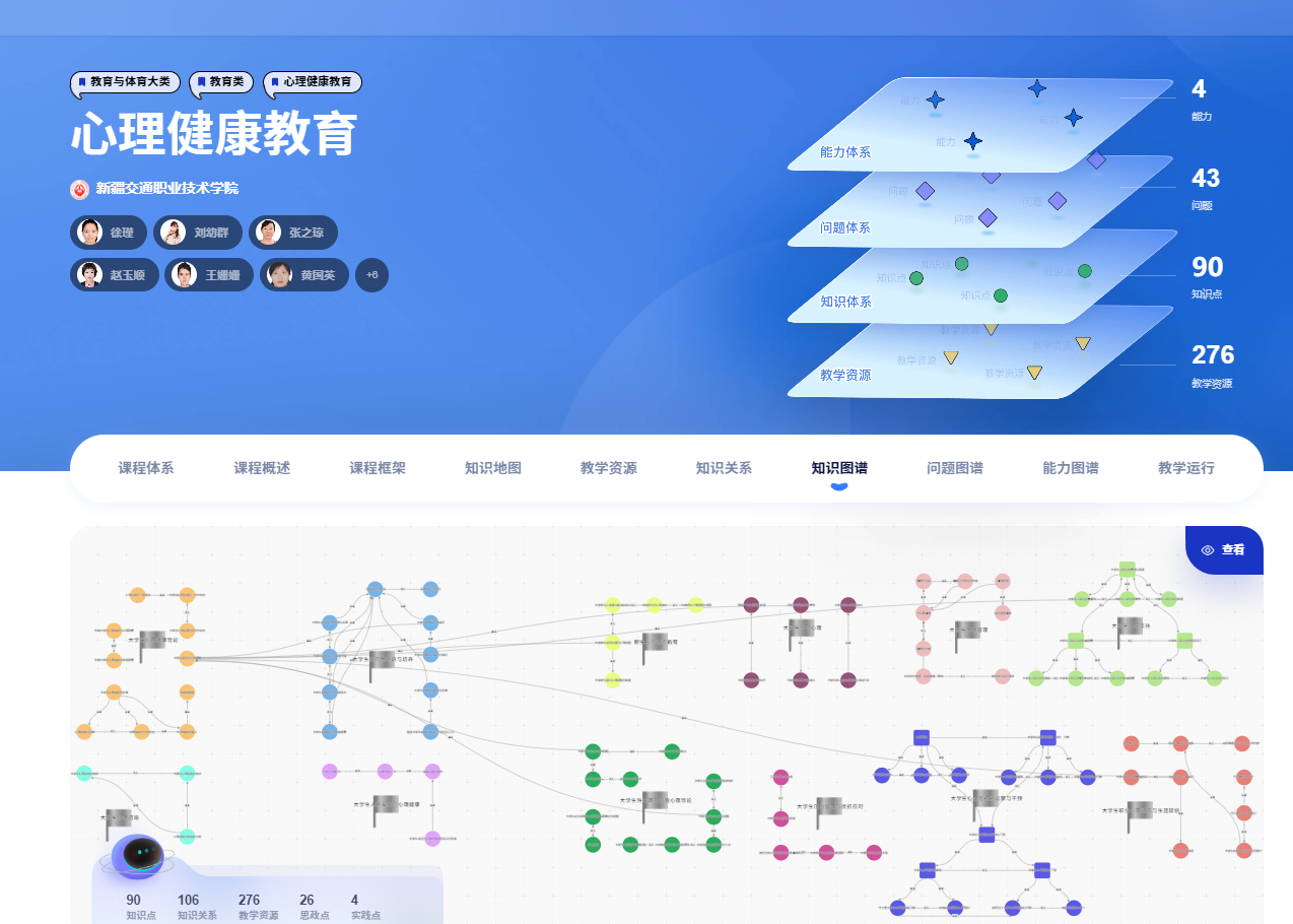 《心理健康教育》作为自治区首批精品在线开放课程,其知识图谱的建设通过完善教学目标深化,从问题、案例、知识、教学资源四个维度,梳理课程的知识体系,完成知识点的挂载。该知识图谱目前已系统梳理知识点90个、知识关系106个、教学资源276个、思政点26个、实践点4个。