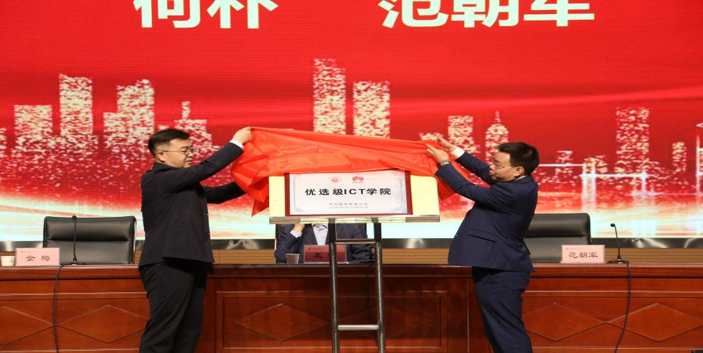 何朴与范朝军共同为华为优先级ICT学院与华为ICT学院云创智行虚拟公司进行揭牌仪式。