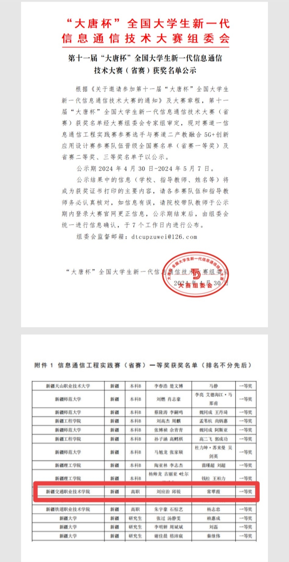 近日,第十一届“大唐杯”全国大学生新一代信息通信技术大赛(省赛)比赛成绩揭晓,机电工程学院城电D231班刘应治、邱锐凭着扎实的专业知识、出色的团队协作能力在高职组信息通信工程实践赛项中荣获省赛一等奖,这是我校学生首次参加该项赛事并成功晋级国赛!