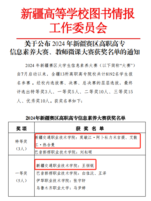 12月19日,新疆高等学校图书情报工作委员会年度工作会议闭幕,会议公布了2024年新疆赛区高职高专院校信息素养大赛结果,学院学生莫敏江·阿卜杜力米吉提、艾散江·热合曼分别荣获特等奖,王恒锐荣获一等奖,学院获得2024年自治区高职高专信息素养大赛“最佳组织奖”、2024年全国高职高专信息素养大赛“最佳组织奖”。