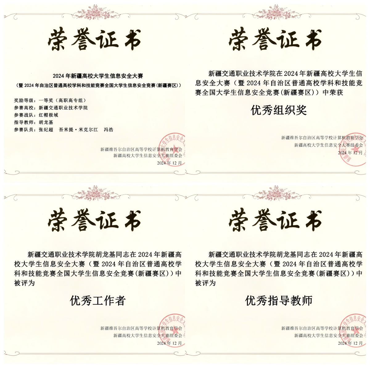本次大赛旨在深化网络安全教育教学改革,提高大学生网络空间安全实战水平,大赛吸引了来自全疆16所学校498支参赛队共1479名学生参加比赛。我院共派出4支参赛队12名选手参赛,通过线上理论考核和CTF解题模式激烈角逐,由张纪超、吾米提·米克尔江、冯浩组成的“红帽极域”参赛队,凭借扎实的专业技能和出色的团队协作精神,在比赛中脱颖而出,荣获高职高专组一等奖。