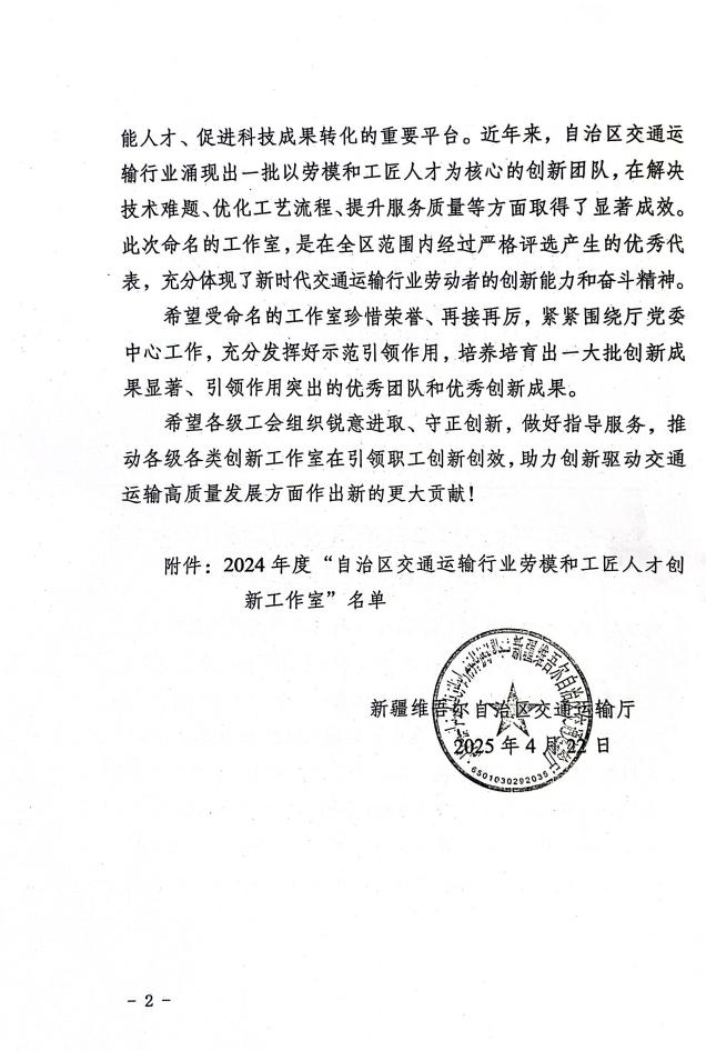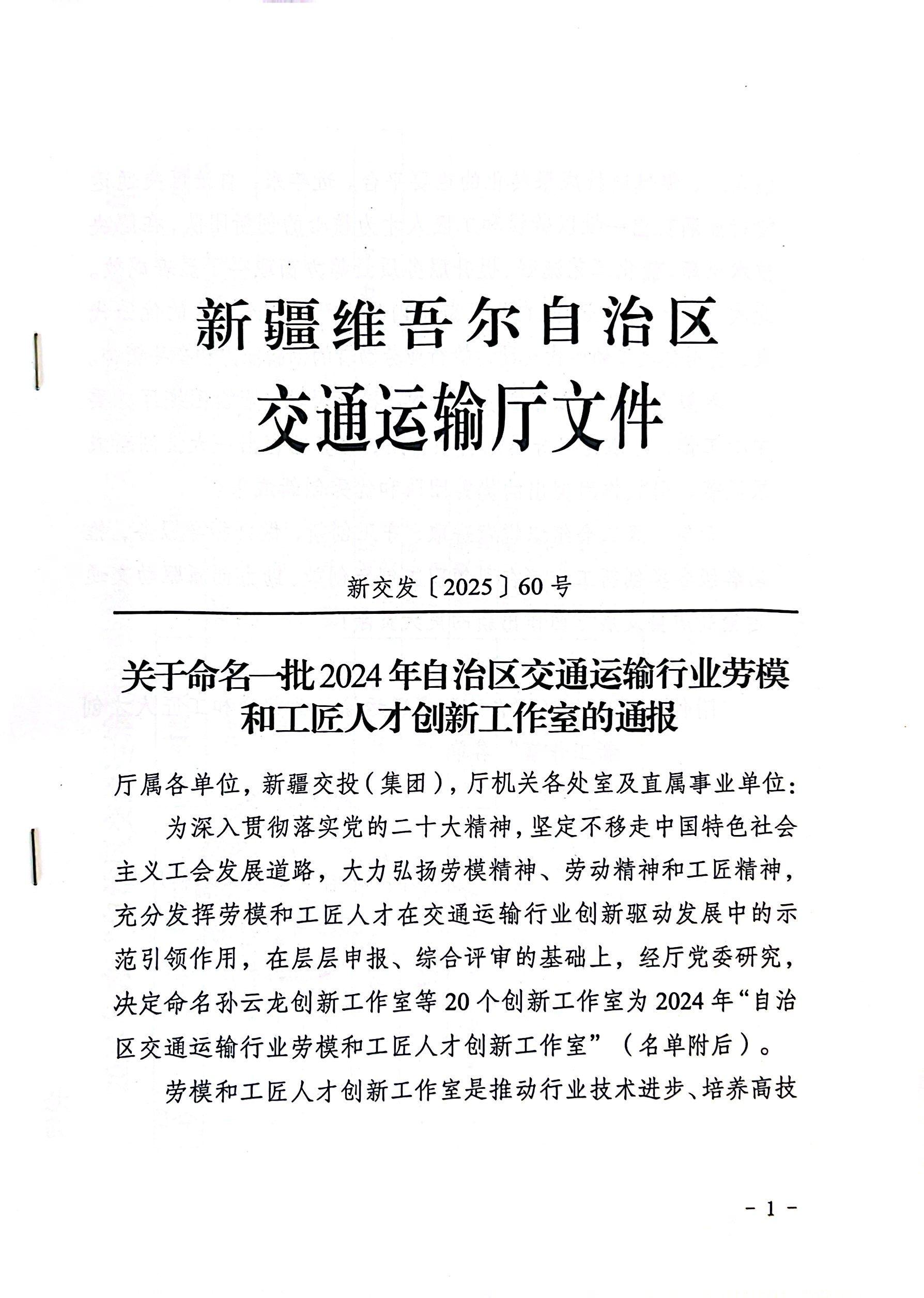 近日,自治区交通运输厅发布《关于命名一批2024年自治区交通运输行业劳模和工匠人才创新工作室的通报》,经层层申报、综合评审,学院马克思主义学院徐瑾创新工作室成功入选,被命名为2024年“自治区交通运输行业劳模和工匠人才创新工作室”。