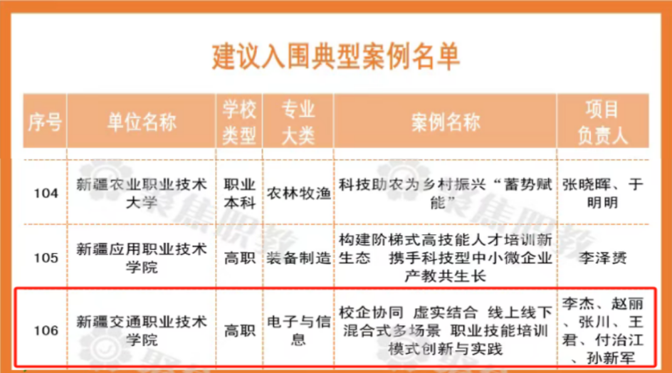 近日,教育部职业教育与成人教育司公布了2025年度《关于职业学校职业技能培训典型案例与优质课程名单的公示》,共确定职业学校职业技能培训典型案例106个,优质课程99门。学院申报的"校企协同、虚实结合、线上线下混合式、多场景职业技能培训模式创新与实践"典型案例,经自治区教育厅评审和推荐,成功入围教育部职成司典型案例。