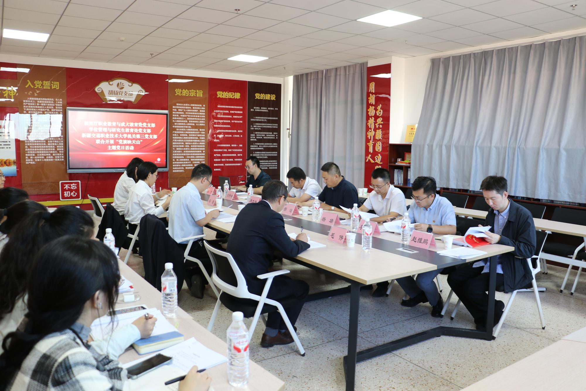 本次活动以“携手过党日,同心促发展‘党旗映天山’”为主题,通过实地调研、理论学习、业务交流等形式,深化党建与职业教育改革融合,促进教育行政管理部门与学校相关部门交流协作。学习交流阶段,全体党员在胡杨党支部会议室集中研学习近平总书记关于弘扬伟大抗战精神的重要论述、《教育强国建设规划纲要》、《中华人民共和国学位法》等内容,与会人员围绕“党建与业务深度融合”展开深入交流。