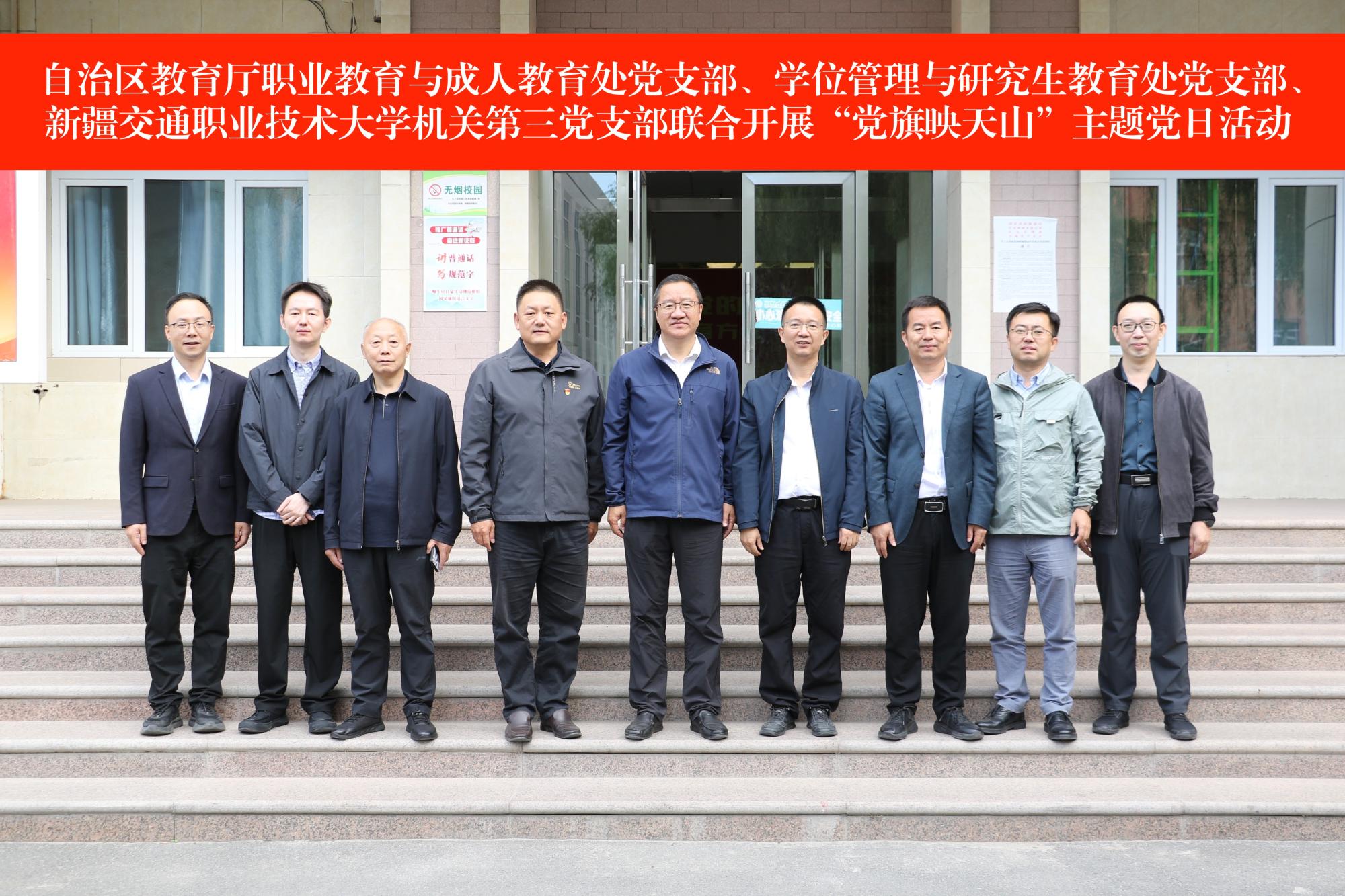 2025年9月3日下午,自治区教育厅职业教育与成人教育处党支部、学位管理与研究生教育处党支部与学校机关第三党支部联合开展“党旗映天山”主题党日活动。学校党委书记刘洪波与自治区教育厅职成处、学位处一行亲切交流。自治区教育厅正处级督学郝治、学位管理与研究生教育处处长滕文静等相关同志及学校机关第三党支部全体党员参加了活动。