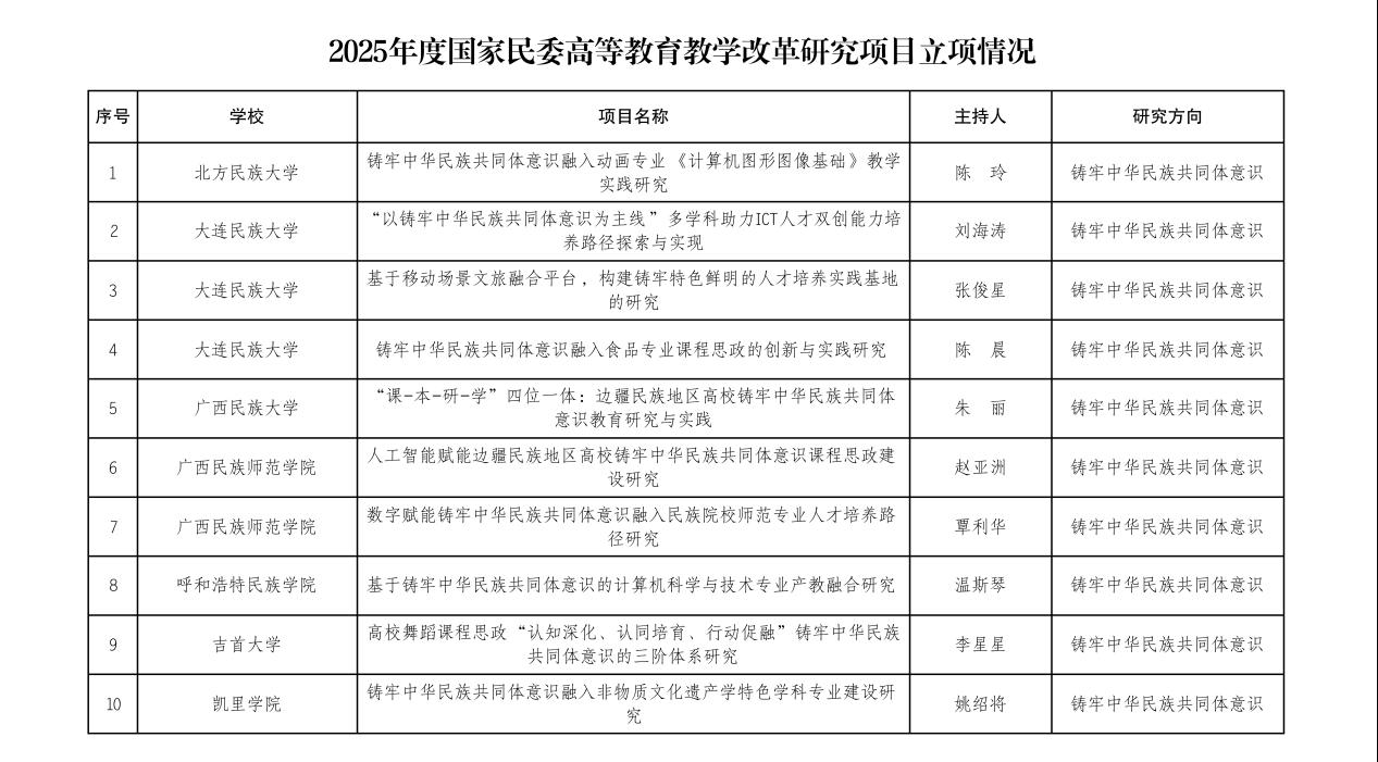 下一步,学校将按照《国家民委科研项目管理办法》要求,为项目提供研究保障,推动研究成果及时转化为教学实践,助力人才培养质量提升。同时,学校将以此次立项为契机,持续深化教育教学改革,为服务党的民族工作高质量发展和教育强国建设贡献力量。