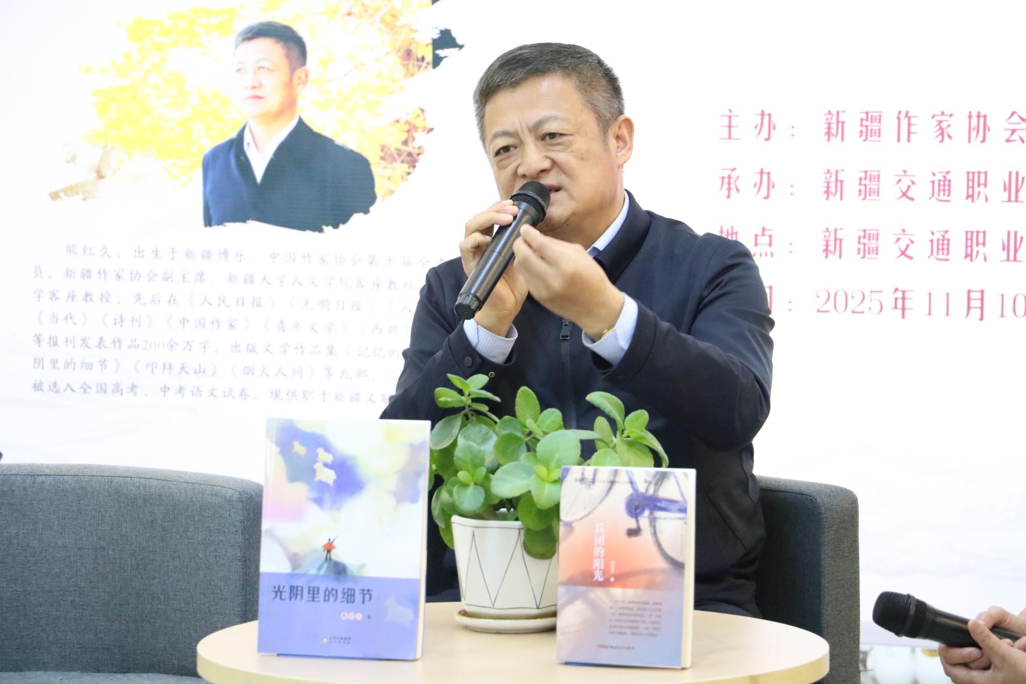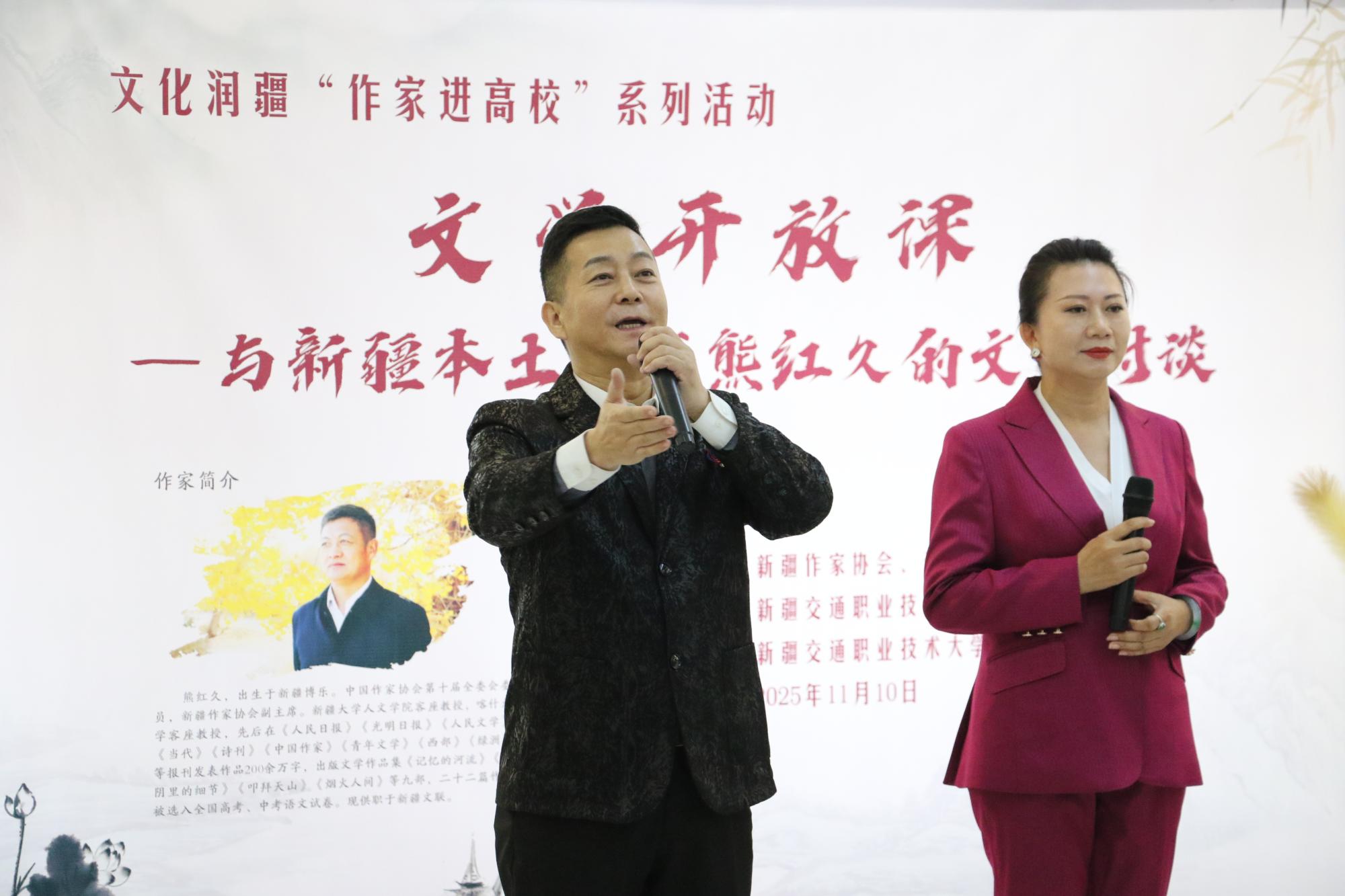 为扎实推动文化润疆工作走深走实,积极搭建新疆本土作家与高校师生深度交流的平台,11月10日,文化润疆“作家进高校”系列活动之“文学开放课——与新疆本土作家熊红久的文学对谈”在学校图书馆大厅温情启幕。众多师生齐聚一堂,共赴一场启迪思想、温润心灵的文学之旅。