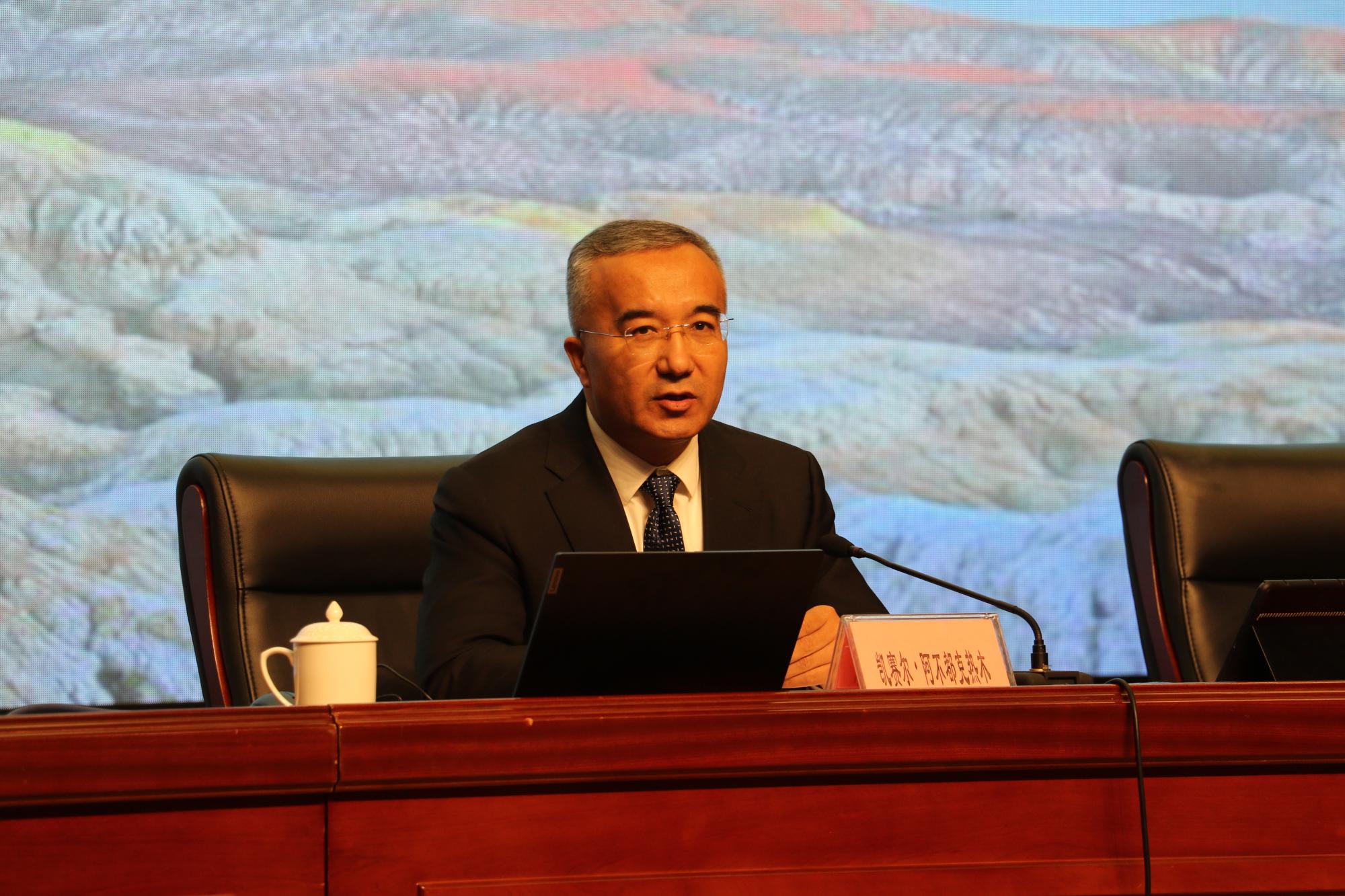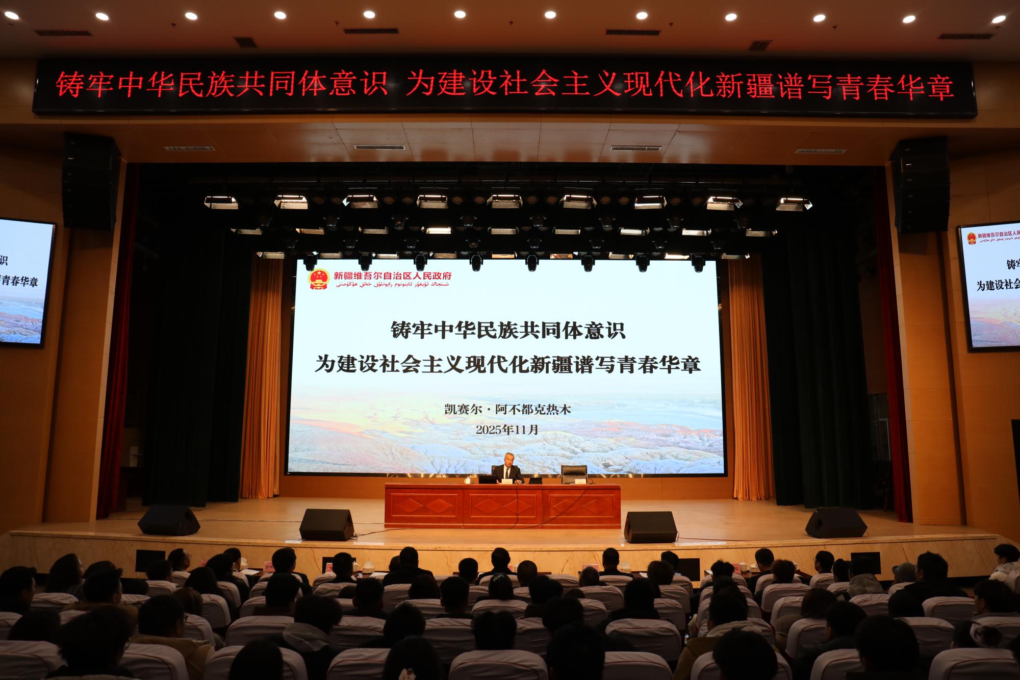 11月18日,自治区政府副主席凯赛尔·阿不都克热木莅临学校,以“铸牢中华民族共同体意识,为建设社会主义现代化新疆谱写青春华章”为主题,为全校750余名师生带来一堂生动的思政课。