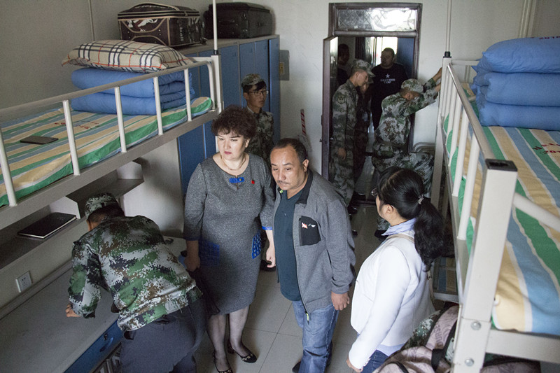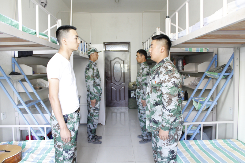 9月10日各连教官进入到学生公寓,指导学生进行内务整理。在活动中,二连的教官负责指导18级新生如何叠被子,他说:“整理内务注重的是细节,毛巾要叠两次放在脸盆边上,鞋要放整齐、成直线摆放,地面要整洁,决不能留卫生死角。”在整个讲解过程中,新生们都积极主动、认真练习。