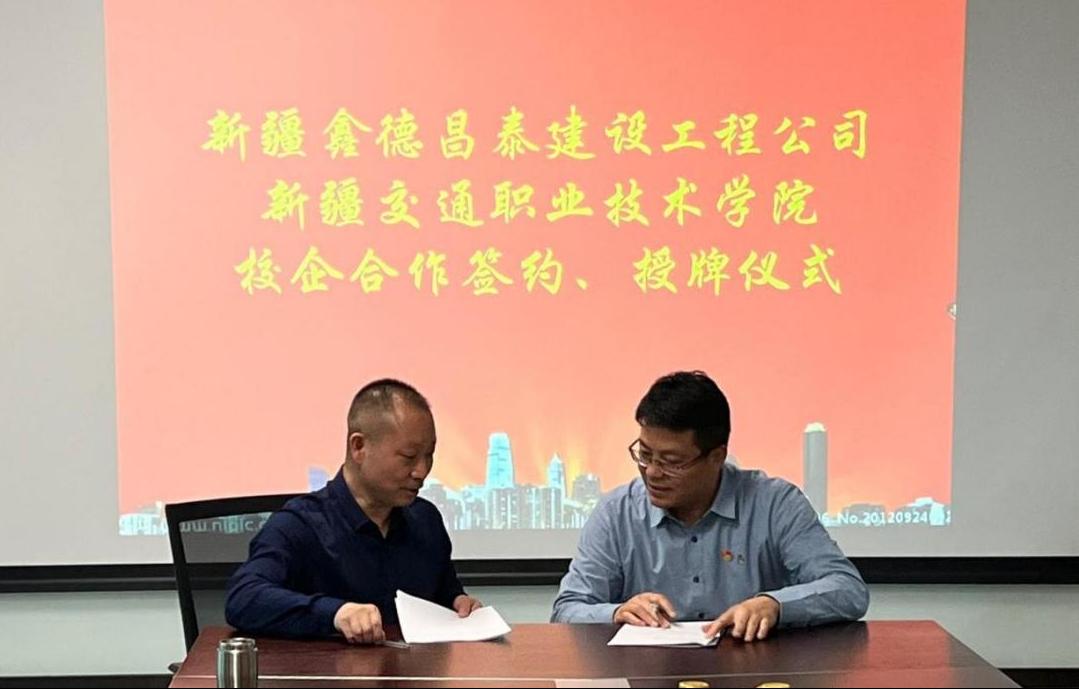 会后,道路桥梁工程学院樊梦兵书记与新疆鑫德昌泰建设工程有限公司总工程师李华代表双方进行校企合作签约;郭社锋院长代表学院向公司授予了“新疆交通职业技术学院实习实训基地”的牌匾。