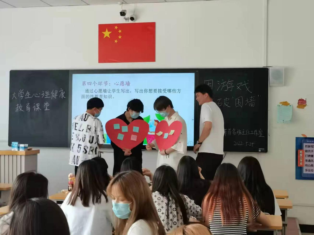 此次德育活动课分为五个环节,第一个环节播放宝宝性教育儿歌《hand in hand》,用一首儿歌把我们带回了小时候,让我们对自己的身体加深了解;第二环节感受身体的奥秘通过讲述男女性身体的差异让学生了解身体提高我保护的能力;第三个环节情景剧用游戏打破“围墙”,通过虚拟的环境打造出大学生在未来中可能会遇到性问题的各种困惑、问题和困难,学生可以自由的进行选择,直面一切可能会发生的后果,从而建立起行为与责任之间的联系;第四个环节心愿墙,通过心愿墙写出学生想要接受哪些方面的性教育知识;第五个环节升华,代老师为每个同学发放信封,主题为“做了父母的我”让同学们假设自己已为人父母,希望自己孩子从小接受怎样的性教育?第二引入“班级心理健康辅导员”这一角色进入课堂,同学们对自己青春期里的一些不明白的心理问题,可以通过班级心理辅导员传递给老师,从而获得咨询和解答。