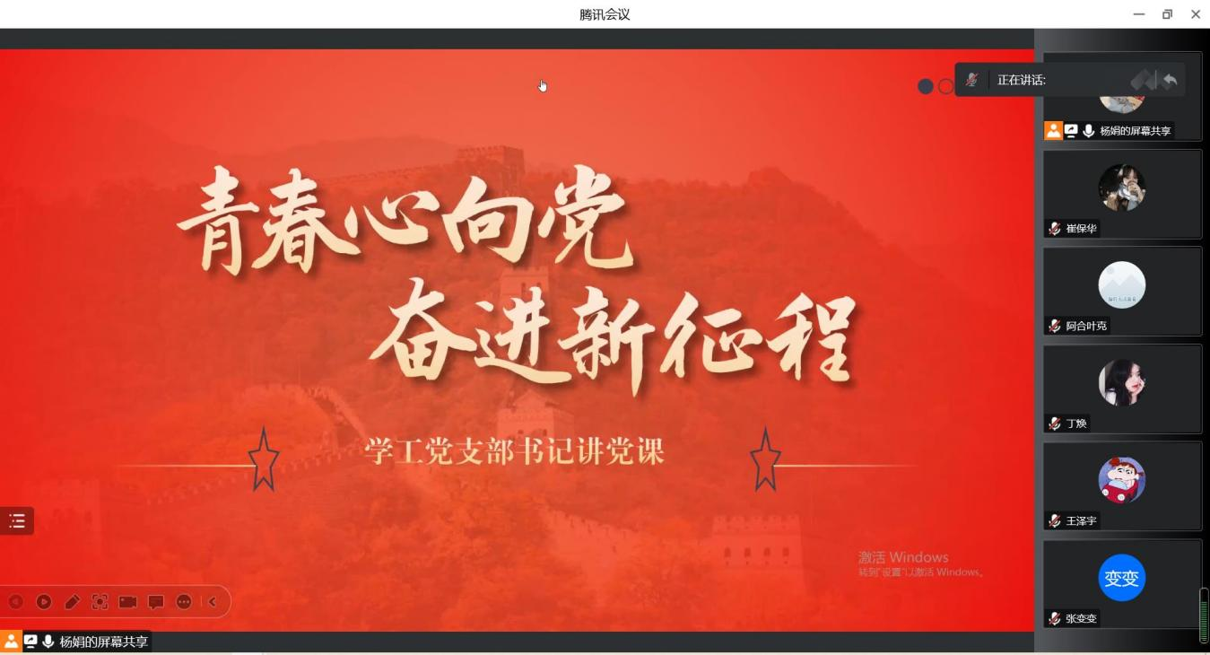 为深入学习贯彻党的二十大精神,追忆初心、弘扬精神、赓续奋进,10月27日晚,学工党支部开展了以“青春心向党 奋进新征程”为主题的支部书记讲党课活动。本次学习通过线上会议的形式进行,会议由学工党支部书记杨娟同志主持,参会人员包括学工党支部全体教师党员、学生预备党员、入党积极分子等六十余人次。
