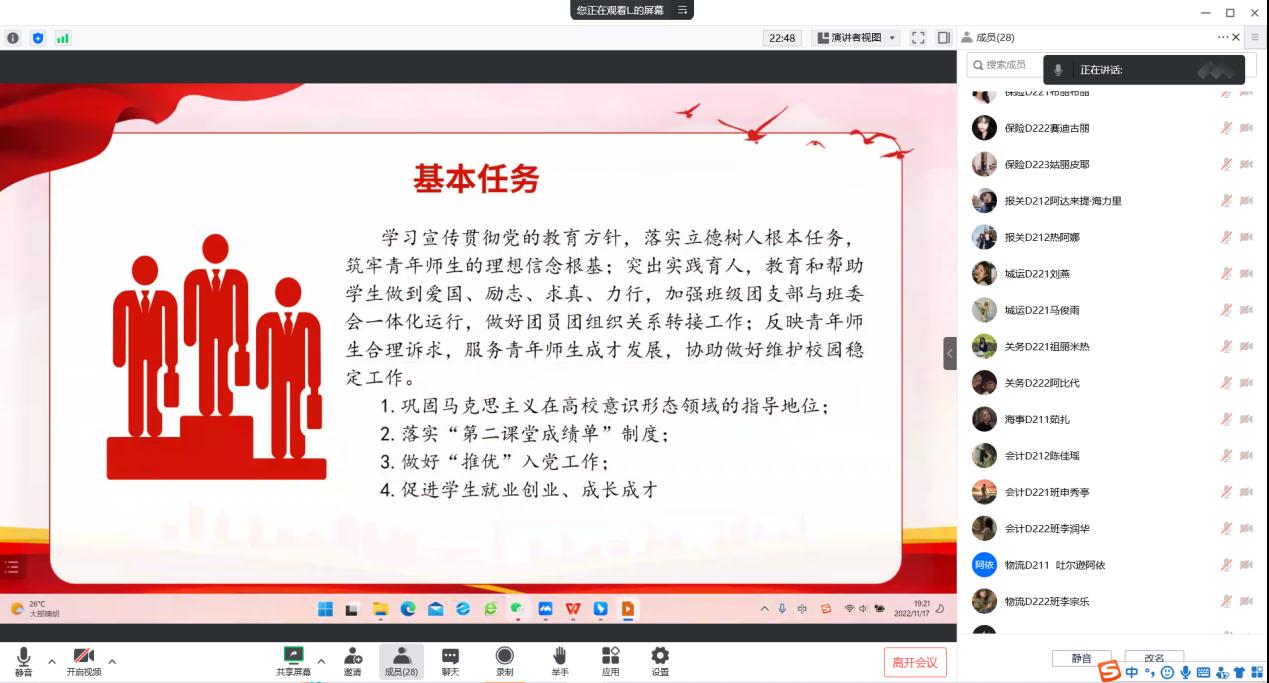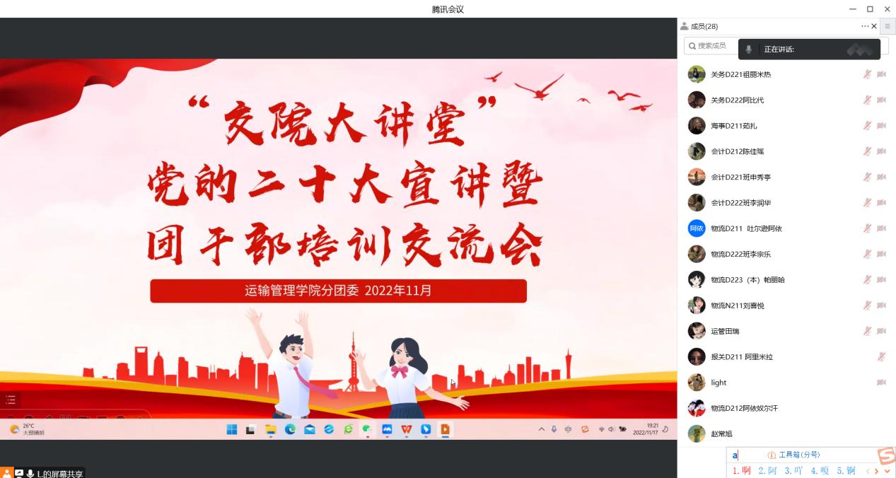 运输管理学院分团委书记魏万云老师在总结讲话中表示,团学干部要把学习宣传贯彻党的二十大精神作为当今一个时期的重大政治任务,新时代青年必须摒弃骄娇二气,增强志气、骨气、底气。在今后工作中不仅要将习近平总书记重要讲话精神内化于心更要外化于行,找准工作切入点、着力点和突破点,将之转化为推进运输管理学院团委发展的实际成效。