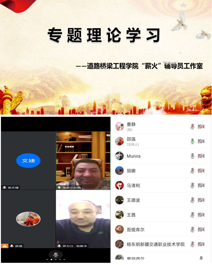 为进一步深入学习贯彻落实党的二十大精神,提升辅导员理论素养,11月21日上午,道路桥梁工程学院“薪火”辅导员工作室开展线上理论专题学习活动,党总支副书记艾尼江·沙迪尔主持,全体辅导员参加学习。