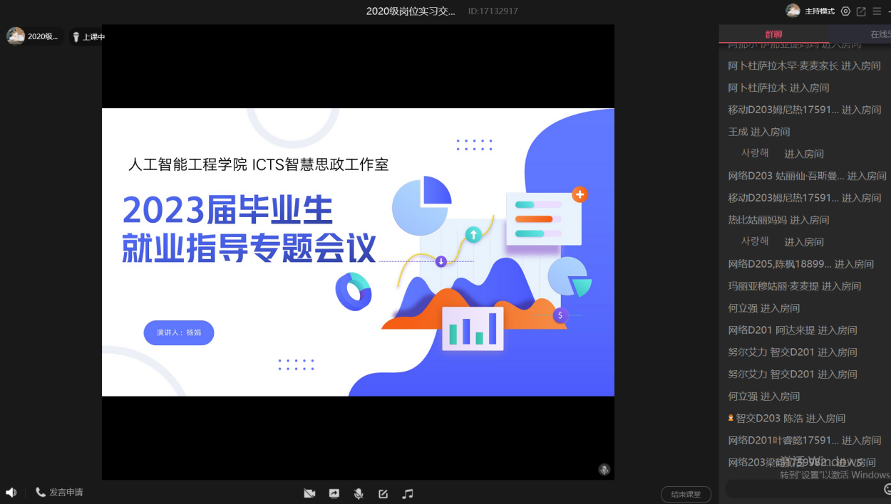 为进一步推进人工智能工程学院2020级学生岗位实习工作,确保2023届毕业生高质量就业,11月23日人工智能工程学院通过QQ课堂直播召开实习与就业工作专题网络会议,人工智能工程学院书记李刚主持会议。