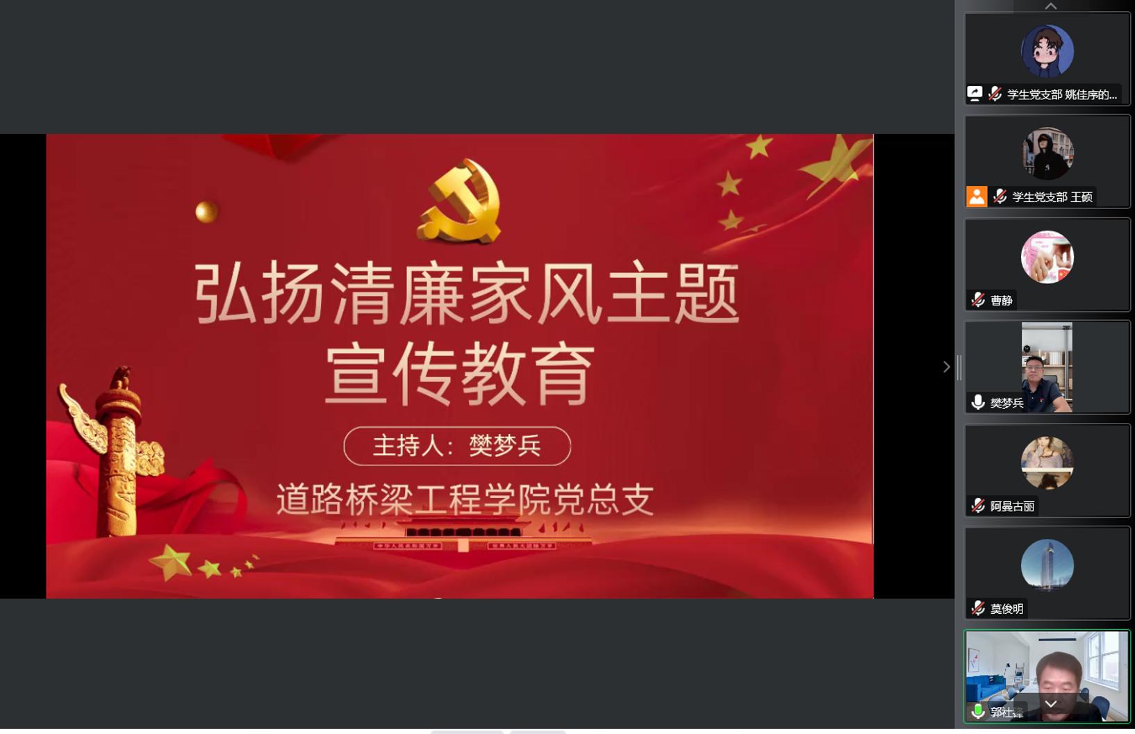 为深入学习习近平总书记关于注重家庭家教家风建设重要论述以及在十九届中央纪委六次全会上的重要讲话精神,弘扬好家风、传播好家训,增强廉洁修身、廉洁齐家的思想自觉和行动自觉,12月11日下午,道路桥梁工程学院党总支开展了弘扬清廉家风主题宣传教育活动。活动由党总支书记樊梦兵主持,全体师生党员参加。