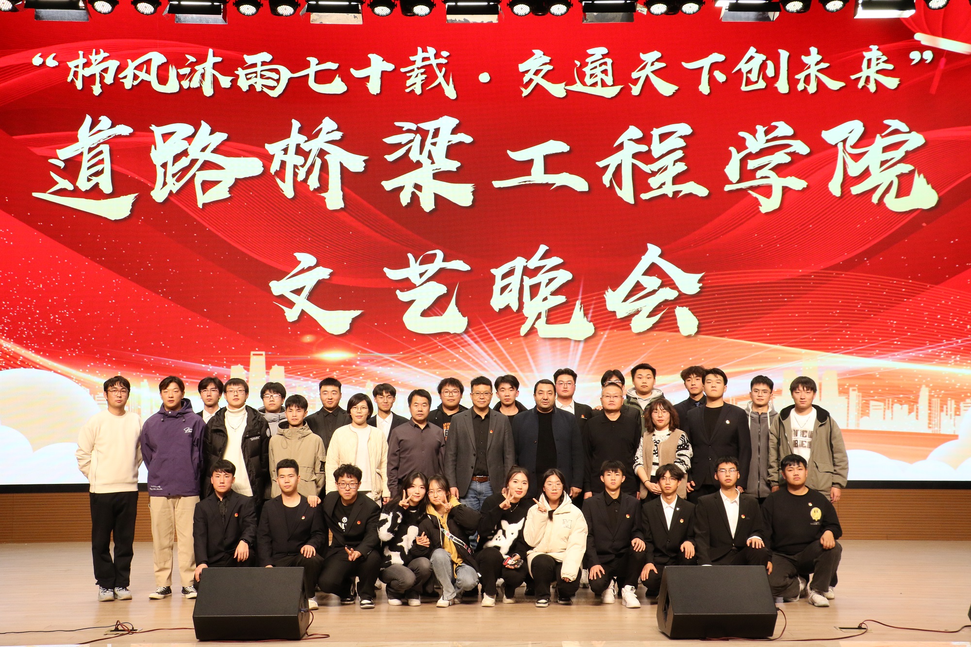 在秋已尽,冬将至的日子里。11月16日晚自习,道路桥梁工程学院在产教楼礼堂举办“栉风沐雨七十载•交通天下创未来”文艺晚会,全院师生代表在这里欢聚一堂,一同观看演出,共享文化盛宴。