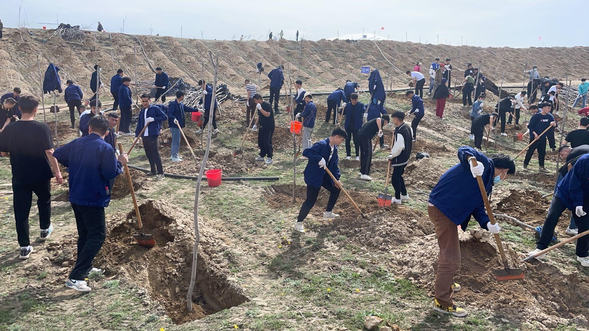 活动现场学生们热情澎湃,积极投身于植树活动中。大家分头行动,有的负责放苗、有的负责施肥,还有的负责栽种。活动中,同学们不畏辛苦,圆满完成了300余株树木的种植任务。