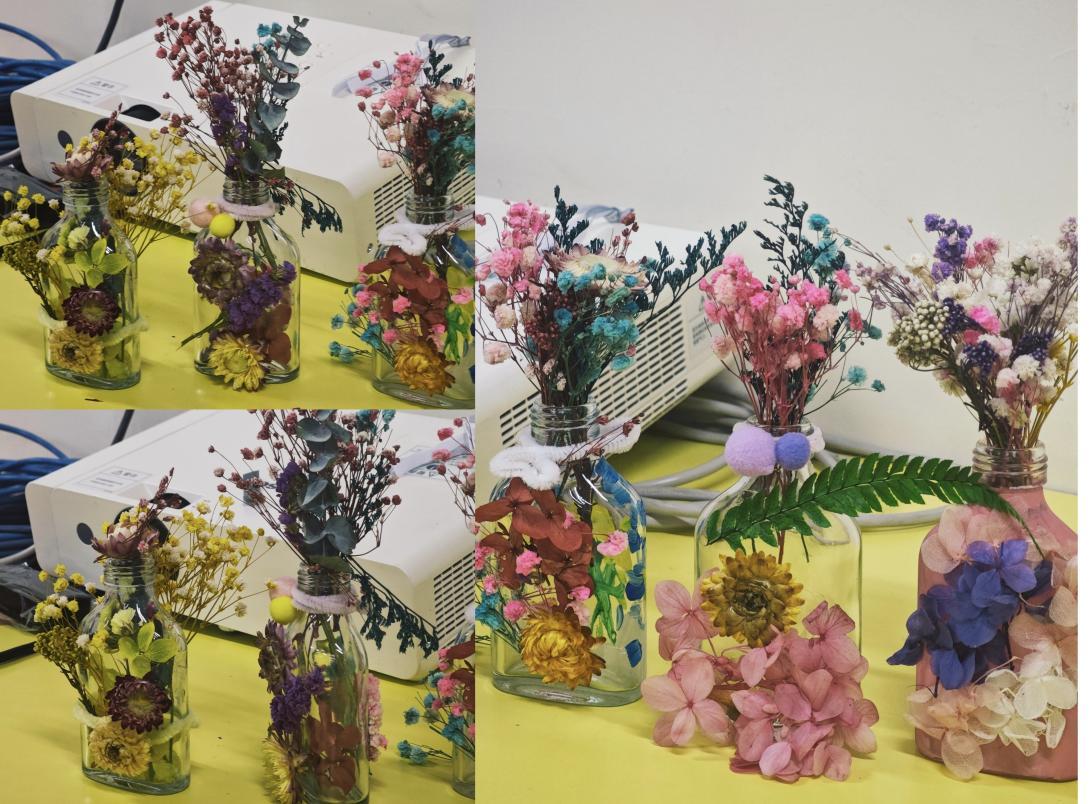 本次手工DIY活动内容分为春日花瓶手绘、植物浮游瓶以及扭扭棒DIY等。活动伊始,负责人向大家介绍本次活动内容并发放相关材料包。同学们经过巧妙的设计和精心制作,将扭扭棒组装成了一朵朵色彩缤纷、栩栩如生的花朵,将一个个普通的玻璃瓶装点成色彩斑斓的彩绘花瓶和植物浮游瓶。