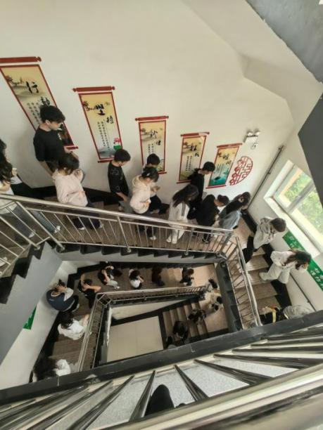13时20分,警报声骤然响起,演练正式启动。模拟地震突发时,学生迅速就近躲避至课桌下方,用书本护住头部;疏散警报拉响后,全体师生立即切换应急模式。在辅导员和楼层安全员的指引下,参演学生弯腰低姿、双手护头,沿安全通道快速撤离至楼外指定区域。整个疏散过程仅用时1分40秒,180余名师生全员安全抵达,无拥挤、无遗漏,高效有序的应急反应充分展现了日常训练的扎实成效。