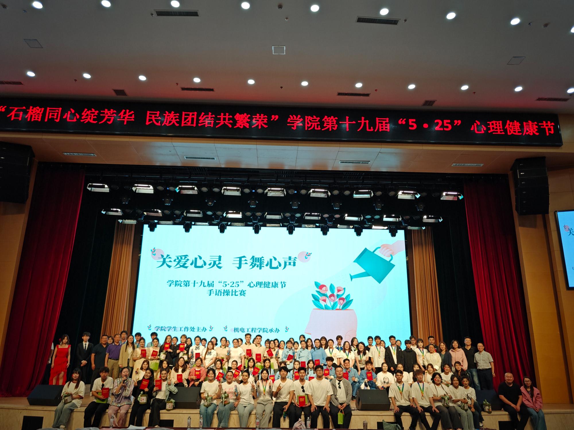 5月27日晚,由学院学生工作处主办、机电工程学院承办的第十九届“5•25”心理健康节之“关爱心灵 手舞心语”手语操大赛在产教融合楼大礼堂顺利举行。共计十支参赛队伍一百余名师生共同参与了此次比赛。
