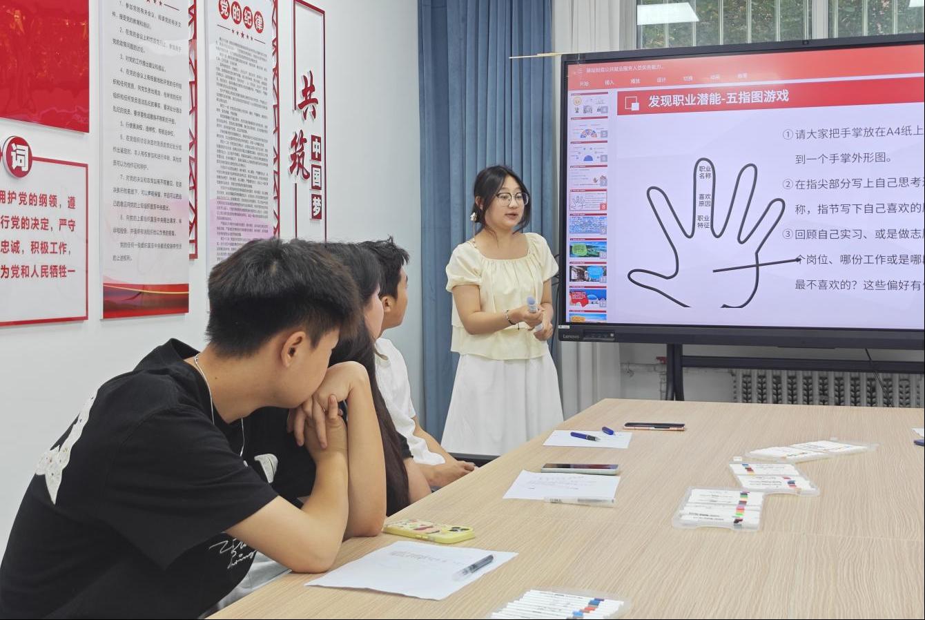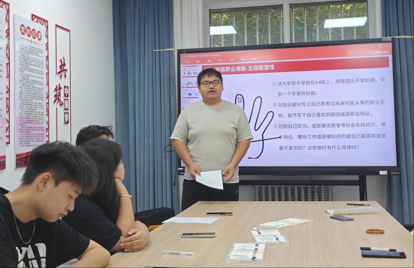 活动开始,工作人员为参与同学发放A4纸、彩笔等材料。主讲人杨娟老师以“用手掌丈量职业理想”为切入点,详细讲解“生涯五指图”的绘制逻辑:将手掌轮廓描摹于纸上,五根指尖分别对应“目标职业名称”,指节区域则需填写“选择该职业的核心动机”或“职业关键特征”。“这不仅是一幅手绘作品,更是一次自我对话——通过视觉化呈现,帮助大家更清晰地梳理兴趣、能力与职业期待的关联。”杨娟老师的引导引发了同学们的热烈思考。