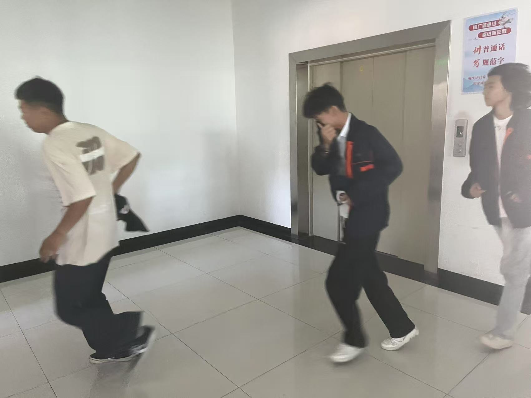 上午9时许,演练正式启动。模拟场景中,机电实训室因设备电路故障突发火情,火灾自动报警系统瞬间响应:应急广播循环播报“火情警报,请有序疏散”指令,消防警铃响彻楼层,安全出口指示灯与疏散指示标志同步亮起,防排烟系统自动启动,全方位还原真实火灾场景。全体参演师生迅速反应,用湿毛巾捂住口鼻、弯腰低姿沿疏散标识撤离,仅用时5分钟即完成全楼疏散。各班级第一时间清点人数并上报,确保无人员遗漏。