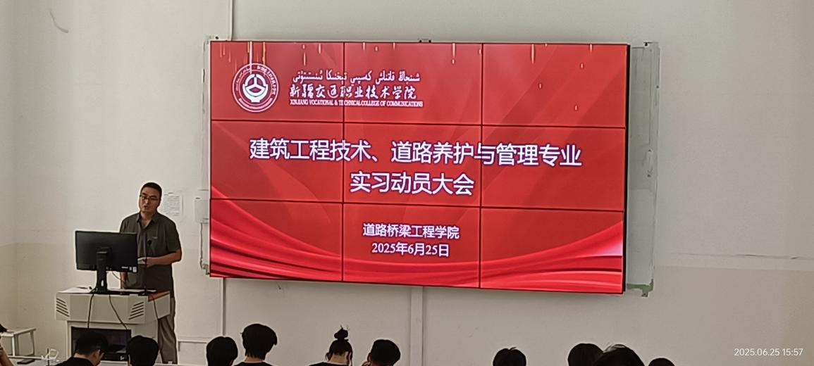 会上,建筑专业负责人李肖、养护专业骨干教师努丽曼古丽·米吉提分别立足专业特色,从实践技能提升、职业素养培养等方面对学生提出具体要求,为实习目标指明方向。学生发展中心主任邵强着重强调安全纪律,强化学生安全责任意识;辅导员马清利对“工学云”实习管理系统进行细致讲解与演示,以信息化手段赋能实习过程管理。