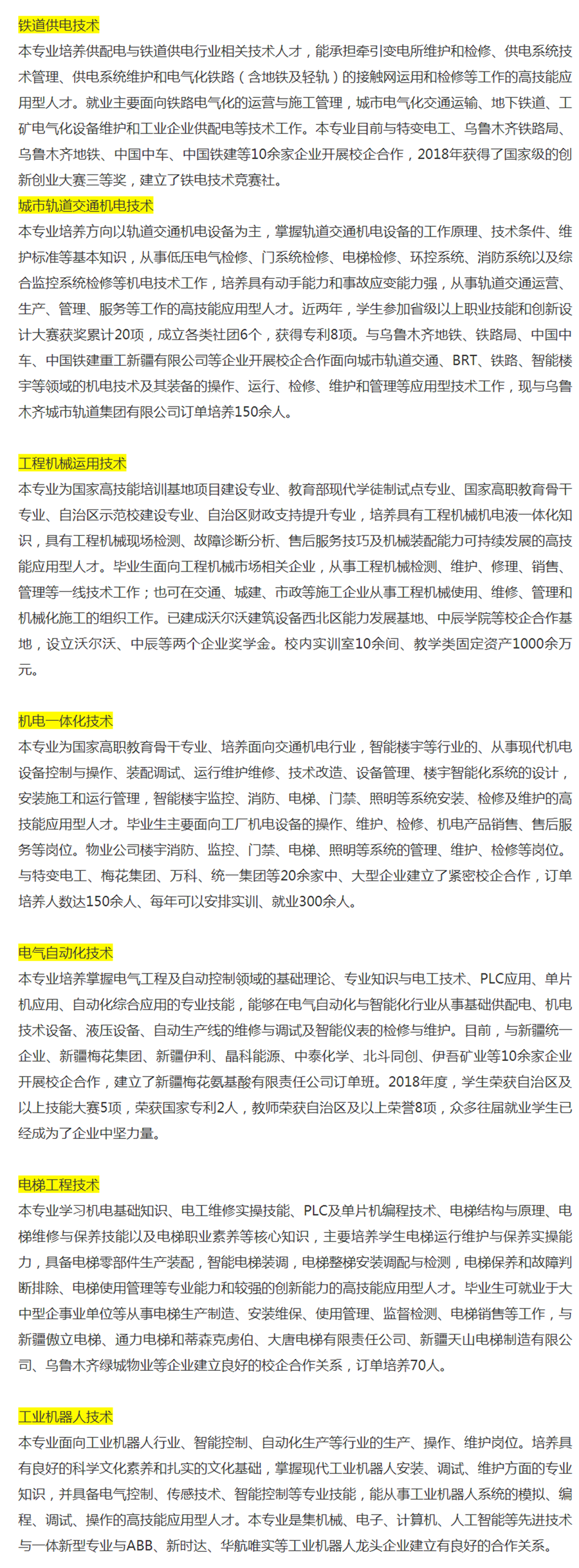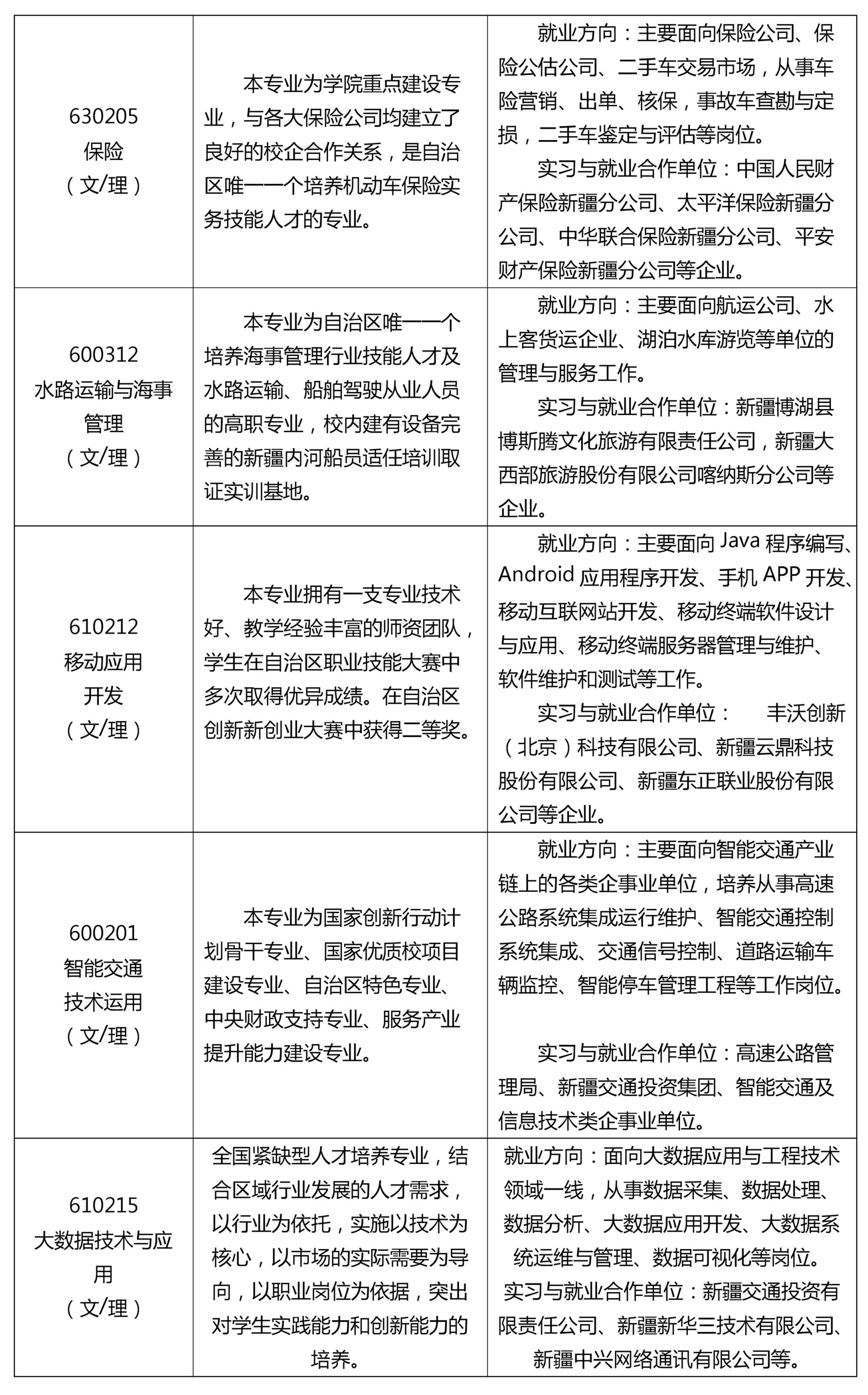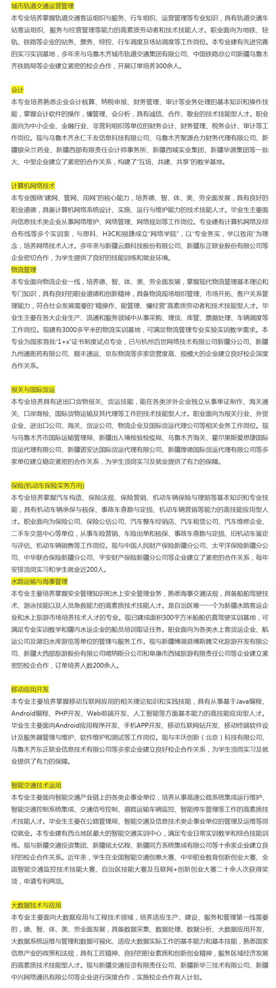 学院主动适应国家“一带一路”和新疆经济社会发展对人才的需求,突出综合交通运输行业特色,围绕着综合交通发展设有道路桥梁工程学院、汽车工程学院、机电工程学院、运输管理学院、人文基础教育学院、马克思主义学院、继续教育学院七个教学分院。开设有道路桥梁工程技术、汽车运用与维修技术、铁道工程技术、城市轨道交通运营管理、水路运输与海事管理、报关与国际货运等38个高职专业。现已建成自治区级特色专业9个、中央财政支持专业4个。学院积极推进校企合作、产教融合,依托道路桥梁工程、交通运输工程、机械电子工程、汽车运用工程四个研究中心积极为行业、企业提供技术服务,提升学院科研水平及服务社会能力。