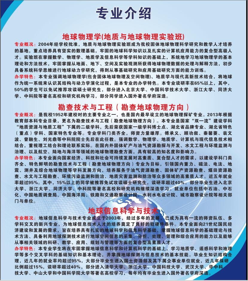 德赢官网现有三个专业:地球物理学、勘查技术与工程、地球信息科学与技术。其中勘查技术与工程专业于2019年6月通过中国工程教育专业认证,