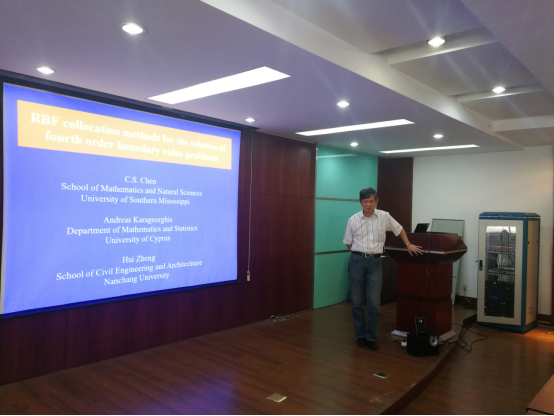 (通讯员 蔡建超)6月24日,受德赢官网熊熊院长和蔡建超教授邀请,美国南密西西比大学(The University of Southern Mississippi)陈清祥教授到德赢官网进行交流,交流期间陈清祥教授做了题为《RBF collocation methods for the solution of fourth order boundary value problems》的学术报告。陈教授详细报告了基于径向基函数映射法求解四阶边值问题,特别考虑了Kansa法和近似特别解MAPSI法。该方法的新颖之处在于包含了位于所考虑问题区域之外的幽灵点。正是这些点的加入提高了该方法的准确度和稳定性。最后对数值例子的误差进行了比较分析,验证了方法的有效性。