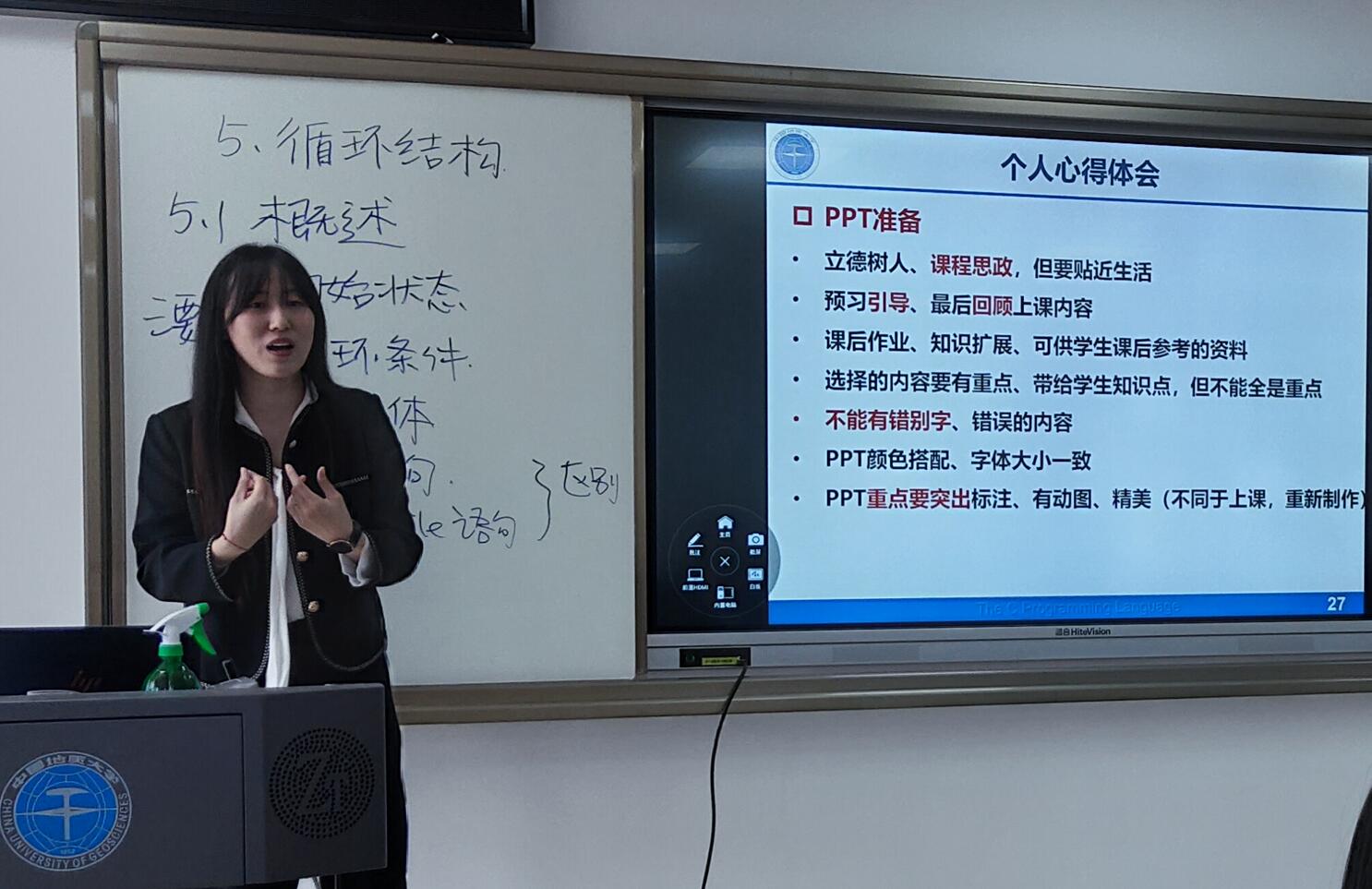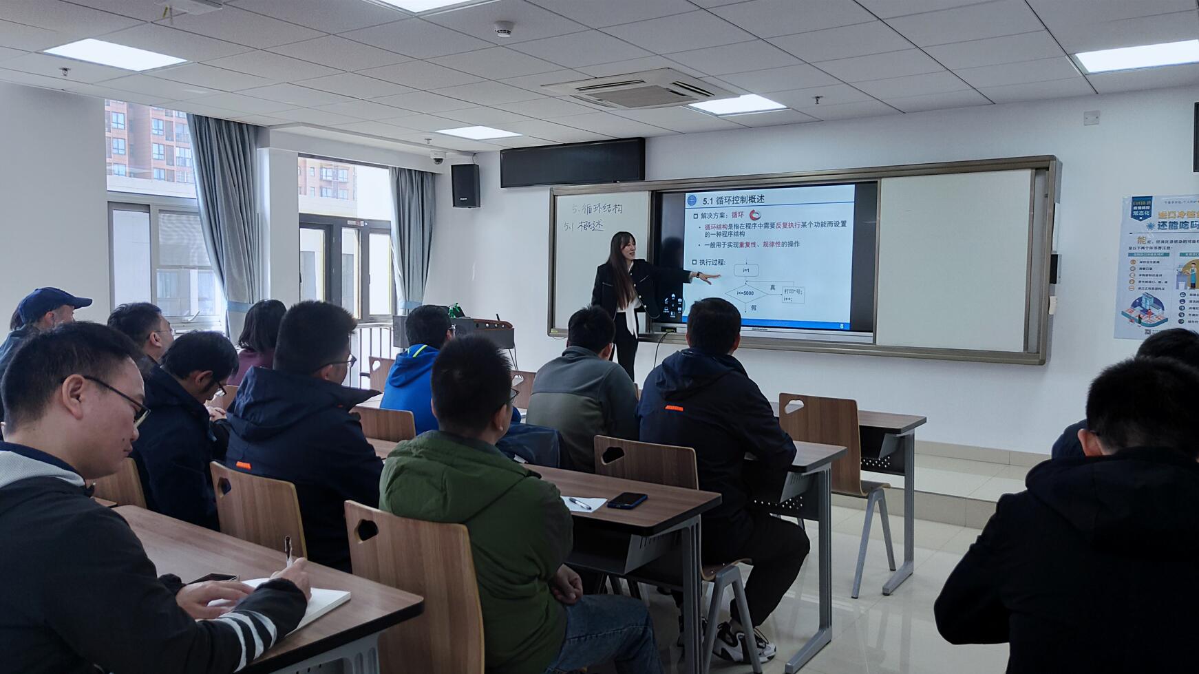 董老师给大家讲授了10分钟的教学片段,讲授内容节选自《C语言程序设计》课程中的第五章《循环结构程序设计》。她从新冠疫情期间,复旦大学博士生用130行大码,提高了核酸核查的效率和精度的案例入手,基于问题导入教学模式,使学习更加直观和形象化,并将课程思政有机地融入了教学内容。教师们听的都很认真,有的拿出手机拍照,有的拿出笔记本认真记录。