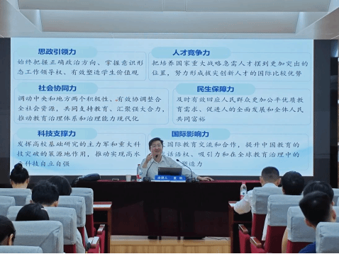 夏帆副校长以《从教育大国迈向教育强国》为题,系统回顾了我国教育事业取得的辉煌成就,深刻阐述了建设教育强国的战略支撑与核心任务,强调了教育在培养党和国家的栋梁之才、支撑科技自立自强、服务国家高质量发展中的关键作用,勉励青年党员要胸怀“国之大者”,锤炼过硬本领,勇当新征程上的开路先锋和事业闯将。